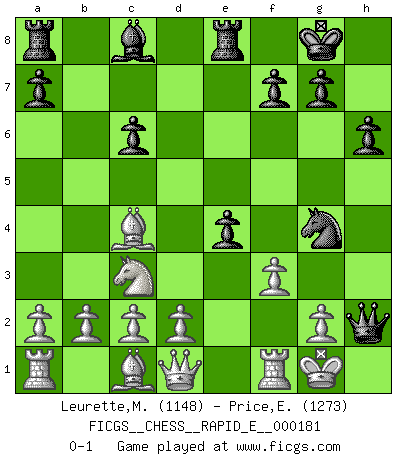 Last move : 0-1 2017 January 28 13:26:39 [Event "FICGS__CHESS__RAPID_E__000181"] [Site "FICGS"] [Date "2017.01.16"] [Round "1"] [White "Leurette,Marc-Antoine"] [Black "Price,Eric"] [Result "0-1"] [WhiteElo "1148"] [BlackElo "1273"] 1.e4 e5 2.Nf3 Nc6 3.Bc4 Nf6 4.Ng5 d5 5.exd5 Na5 6.Bb5+ c6 7.dxc6 bxc6 8.Be2 h6 9.Nf3 e4 10.Ne5 Bd6 11.Nc4 Nxc4 12.Bxc4 O-O 13.Nc3 Re8 14.O-O Bxh2+ 15.Kxh2 Ng4+ 16.Kg1 Qh4 17.f3 Qh2+ 0-1 Two knights defense Kingside Castling by player Black (move 12) Kingside Castling by player White (move 14) Player Black won this chess game. Follow this game move after move (download)A sacrifice is best refuted by accepting it. (Wilhelm Steinitz) Modernes Schach sorgt sich zuviel um Dinge wie Bauernstruktur usw. Vergessen Sie das, Schachmatt beendet das Spiel! (Nigel Short) Después de la respuesta de las negras a 1.e4 con 1..e5, se quedan siempre tratando de entrar dentro del juego. (Howard Staunton) Il vaut toujours mieux jouer un plan faux de façon logique que de n'avoir pas de plan du tout. (Victor Kortchnoï) Imagination is more important than knowledge. Knowledge is limited. Imagination encircles the world. (Albert Einstein)