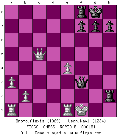 Last move : 0-1 2017 January 29 18:58:21 [Event "FICGS__CHESS__RAPID_E__000181"] [Site "FICGS"] [Date "2017.01.16"] [Round "1"] [White "Bromo,Alexis"] [Black "Usan,Kavi"] [Result "0-1"] [WhiteElo "1069"] [BlackElo "1234"] 1.d4 d5 2.c4 dxc4 3.Nc3 e6 4.a3 Nf6 5.e3 Bd6 6.Bxc4 O-O 7.Nf3 Nc6 8.h3 e5 9.dxe5 Nxe5 10.Nxe5 Bxe5 11.Qb3 b6 12.O-O Bb7 13.Rd1 Qe7 14.Nd5 Qc5 15.Nxf6+ Bxf6 16.Re1 Qg5 17.e4 Qg6 18.Bd3 Be5 19.Bd2 Rad8 20.Bb4 c5 21.Bxc5 bxc5 22.Qxb7 Rxd3 23.Qxa7 Rxh3 24.Qxc5 Rh2 25.g3 Bxg3 26.fxg3 Qxg3+ 27.Kf1 Qf3+ 0-1 Queen's gambit accepted Kingside Castling by player Black (move 6) Kingside Castling by player White (move 12) Player Black won this chess game. Follow this game move after move (download)A great player and a great example for many. His book My 60 Memorable Games had a big impact on me. It is a shame he didn't continue to enrich the world of chess with his unparalleled understanding after 1972. (Jan Timman, about Bobby Fischer's death) Das Zentrum ist der Balkan des Schachbretts - Kriegshandlungen können in jedem Moment ausbrechen. (Aaron Nimzowitsch) Aún el Rey más flojo huye despavorido ante la amenaza de un Jaque doble. (Aaron Nimzowitsch) A chaque perte on perd un peu de soi. (Joël Lautier) The problem with troubleshooting is that trouble shoots back. (Anonymous)