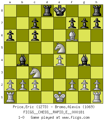 Last move : 1-0 2017 January 22 19:22:36 [Event "FICGS__CHESS__RAPID_E__000181"] [Site "FICGS"] [Date "2017.01.16"] [Round "1"] [White "Price,Eric"] [Black "Bromo,Alexis"] [Result "1-0"] [WhiteElo "1273"] [BlackElo "1069"] 1.e4 e5 2.Nf3 Nc6 3.Bb5 d6 4.d4 Bg4 5.Nc3 a6 6.Bxc6+ bxc6 7.dxe5 dxe5 8.Bg5 Nf6 9.Qxd8+ Rxd8 10.Nxe5 Bb4 11.Bxf6 1-0 Ruy Lopez : Old Steinitz defense Player White won this chess game. Follow this game move after move (download)On the chessboard, lies and hypocrisy do not survive long. (Emanuel Lasker) Wer mein Gambit spielt, muß bereit sein, alle Brücken hinter sich abzubrechen. Es verändert den ganzen Menschen. Es wirkt wie ein Zauberstab und fördert verkümmerte, gute Charakter- eigenschaften wieder zu Tage. (Emil Joseph Diemer) Realmente no sabemos como el juego fue inventado, aunque hay sospechas. Tan pronto como descubramos a los culpables, se los haremos saber. (Bruce Pandolfini) Je crois qu'il existe des manières très spécifiques de jouer efficacement contre une machine. Evidemment, nous n'avons aucune chance en technique pure, parce que l'ordinateur calcule de manière parfaite. Mais lorsque nous faisons appel à notre cerveau, en utilisant l'intuition et la compréhension, alors nous restons beaucoup plus forts. (Anatoli Karpov) . 'gn is not allowed in chess unless n is an integer between 1 and 8 inclusive, where 1 and 8 are to interpreted as the standard numerals standing for integers in the ordered real-closed field R, with the *canonical* ordering. (As opposed to, say, an integer in the domain Z[2+i*sqrt(5)] or an integer in some exotic Grothendieck topos). (Normajean Yates)