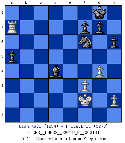 Last move : 0-1 2017 February 4 10:40:19 [Event "FICGS__CHESS__RAPID_E__000181"] [Site "FICGS"] [Date "2017.01.16"] [Round "1"] [White "Usan,Kavi"] [Black "Price,Eric"] [Result "0-1"] [WhiteElo "1234"] [BlackElo "1273"] 1.d4 Nf6 2.Nc3 d5 3.Bg5 Nbd7 4.e3 e6 5.e4 dxe4 6.Nxe4 Be7 7.Bxf6 Nxf6 8.Ng5 O-O 9.N1f3 c5 10.Be2 Qb6 11.b3 Rd8 12.c3 cxd4 13.cxd4 Bb4+ 14.Kf1 h6 15.Nh3 Bd7 16.a4 Bc6 17.g3 Bc3 18.Rb1 Bxd4 19.Qe1 a5 20.Rg1 Bc5 21.Ne5 Bb4 22.Qc1 Be4 23.Nc4 Qd4 24.Ra1 e5 25.f3 Bd3 26.Bxd3 Qxd3+ 27.Kf2 Rac8 28.Rd1 Qxb3 29.Rxd8+ Rxd8 30.Nxe5 Bc3 31.Rb1 Qa2+ 32.Kf1 Bxe5 33.Rxb7 Qxa4 34.Nf2 Qa1 35.Qxa1 Bxa1 36.Ra7 Bc3 37.Kg2 Rd2 38.g4 Rxf2+ 39.Kxf2 Bd4+ 0-1 Queen's pawn game Kingside Castling by player Black (move 8) Player Black won this chess game. Follow this game move after move (download)I have added these principles to the law: get the Knights into action before both Bishops are developed. (Emanuel Lasker) Ich verachte die Medien. (Robert James Fischer) Mis oponentes también hacen buenas movidas. A veces yo no tomo esas cosas en consideración. (Bobby Fischer) Comme les marins qui ont mille raisons différentes d'aller en mer, les joueurs d'échecs en ont tout autant avant de s'installer devant une table et jouer... (Vincent Bertignac, philosophe) The difference between perseverance and obstinacy is that one comes from a strong will, and the other from a strong won't. (Henry Ward Beecher)