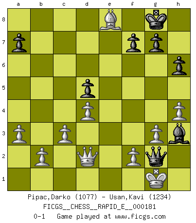 Last move : 0-1 2017 February 19 9:43:44 [Event "FICGS__CHESS__RAPID_E__000181"] [Site "FICGS"] [Date "2017.01.16"] [Round "1"] [White "Pipac,Darko"] [Black "Usan,Kavi"] [Result "0-1"] [WhiteElo "1077"] [BlackElo "1234"] 1.e4 e5 2.Nf3 Nc6 3.a3 Nf6 4.Nc3 Nd4 5.Nxe5 Bc5 6.h3 O-O 7.d3 d5 8.Bg5 Qd6 9.Bxf6 Qxf6 10.Nf3 dxe4 11.Nxe4 Re8 12.Be2 Qb6 13.O-O Qh6 14.Nxd4 Bxd4 15.c3 Be5 16.Re1 Qf4 17.g3 Qh6 18.h4 Qg6 19.Bf3 Be6 20.d4 Bd6 21.Nxd6 cxd6 22.Bxb7 Rab8 23.Bc6 Red8 24.Qd2 Bh3 25.Re2 h6 26.Rae1 Qf5 27.Re7 d5 28.Ba4 Qf3 29.Re8+ Rxe8 30.Rxe8+ Rxe8 31.Bxe8 Qg2+ 0-1 King's pawn game Kingside Castling by player Black (move 6) Kingside Castling by player White (move 13) Player Black won this chess game. Follow this game move after move (download)Only sissies Castle. (Rob Sillars) Deine Wertungszahl - vorausgesetzt einige Jahre schachliche Anstrengung - entspricht etwa dem zehnfachen Deines IQ plus 1000. (Jonathan Levitt) La pasion por jugar al Ajedrez es una de las mas inexplicables en el mundo. (H.G. Wells) Si le désir cupide (et stupide) de gagner est une inépuisable source de souffrance, une combinaison brillante sur l'échiquier est une découverte : le coquelicot qui s'épanouit lorsque apparaît la Voie Lactée. (Arrabal) I've lost money so fast in these clubs it's left me reeling. I've read every poker book ever written, but the only way to get better at the game is to go out and play with people who are really good. The problem is, you stand to lose a lot of money doing it. (Matt Damon)