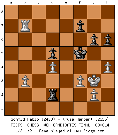 Last move : 1/2-1/2 2017 May 5 21:12:14 [Event "FICGS__CHESS__WCH_CANDIDATES_FINAL__000014"] [Site "FICGS"] [Date "2017.01.26"] [Round "2"] [White "Schmid,Pablo"] [Black "Kruse,Herbert"] [Result "1/2-1/2"] [WhiteElo "2429"] [BlackElo "2525"] 1.e4 e5 2.Nf3 Nc6 3.Bc4 Nf6 4.d3 Bc5 5.c3 d6 6.Bb3 O-O 7.Nbd2 a5 8.O-O Be6 9.Re1 Bxb3 10.Qxb3 a4 11.Qc2 Re8 12.Nf1 h6 13.Be3 Bxe3 14.Nxe3 b5 15.h3 Qd7 16.b4 axb3 17.axb3 b4 18.c4 Reb8 19.Nd5 Qd8 20.Rxa8 Rxa8 21.c5 Nxd5 22.exd5 Ne7 23.d4 Nxd5 24.Qc4 e4 25.Qxd5 exf3 26.cxd6 cxd6 27.Qxf3 g6 28.Qb7 Rb8 29.Qe7 Qxe7 30.Rxe7 Kg7 31.Rd7 Rc8 32.Rb7 Rc1+ 33.Kh2 Rc2 34.f3 Kf6 35.Rxb4 Rd2 36.h4 Kf5 37.Kg3 d5 38.Rb7 Ke6 39.Rb6+ Kf5 40.Rb7 Ke6 41.Rb6+ Kf5 42.Rb7 1/2-1/2 Two knights defense (Modern Bishop's Opening) Kingside Castling by player Black (move 6) Kingside Castling by player White (move 8) This chess game ended in a draw. Follow this game move after move (download)All I want to do, ever, is just play Chess. (Bobby Fischer) Capablanka war das größte Genie der Schachgeschichte! Aber denken sie nicht er habe nichts vom Schach verstanden. Er wusste nur soviel wie er wissen musste um seine Ziele zu erreichen. (Mikhail Moiseyevich Botvinik) El Ajedrez es sobre todo, ¡una pelea!. (Emanuel Lasker) Aucun coup ne doit être joué sans but. (Pedro Damiano) Programmer - an organism that turns coffee into software. (Anonymous)