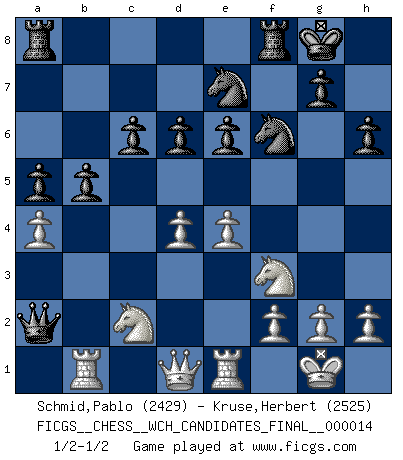Last move : 1/2-1/2 2017 May 1 19:23:25 [Event "FICGS__CHESS__WCH_CANDIDATES_FINAL__000014"] [Site "FICGS"] [Date "2017.01.26"] [Round "6"] [White "Schmid,Pablo"] [Black "Kruse,Herbert"] [Result "1/2-1/2"] [WhiteElo "2429"] [BlackElo "2525"] 1.e4 e5 2.Nf3 Nc6 3.Bc4 Nf6 4.d3 Bc5 5.c3 d6 6.O-O h6 7.a4 a5 8.Na3 O-O 9.Nc2 Ne7 10.Re1 Bb6 11.Be3 c6 12.Bxb6 Qxb6 13.Ne3 Qxb2 14.Rb1 Qa3 15.Bb3 b5 16.d4 exd4 17.cxd4 Be6 18.Bxe6 fxe6 19.Nc2 Qa2 20.Ra1 Qb2 21.Rb1 Qa2 22.Ra1 Qb2 23.Rb1 Qa2 1/2-1/2 Two knights defense (Modern Bishop's Opening) Kingside Castling by player White (move 6) Kingside Castling by player Black (move 8) This chess game ended in a draw. Follow this game move after move (download)We must make sure that Chess will not be like a dead language, very interesting, but for a very small group. (Sytze Faber) Modernes Schach erfordert enorme Anspannung. Es ist für einen normalen Menschen unmöglich das auszuhalten. (Viktor Kortschnoi) Me dio la sensación de como si yo estuviera jugando en contra del mismo Ajedrez. - al estar jugando en contra de Robert Fischer (Walter Shipman) Aux échecs, les retours au sommet sont rares : les dommages psychologiques consécutifs à une défaite sont trop sévères. (Daily Telegraph) Cactus - It is depressed cucumber. (Ilmars Cirulis)