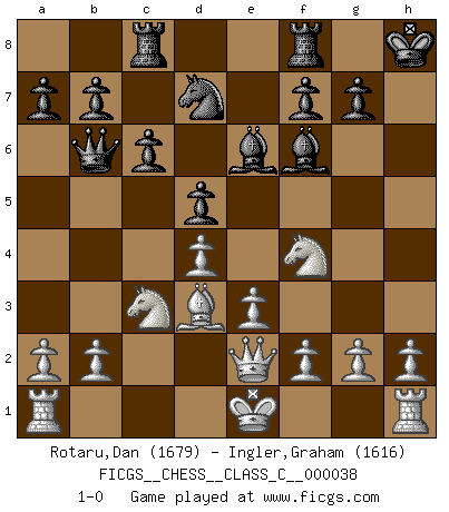 Last move : 1-0 2007 June 8 0:40:45 [Event "FICGS__CHESS__CLASS_C__000038"] [Site "FICGS"] [Date "2007.04.03"] [Round "1"] [White "Rotaru,Dan"] [Black "Ingler,Graham"] [Result "1-0"] [WhiteElo "1679"] [BlackElo "1616"] 1.d4 d5 2.c4 e6 3.Nc3 Nf6 4.cxd5 exd5 5.Bg5 Be7 6.e3 O-O 7.Bd3 c6 8.Qc2 Qb6 9.Bxf6 Bxf6 10.Bxh7+ Kh8 11.Bd3 Be6 12.Nge2 Nd7 13.Nf4 Rac8 14.Qe2 1-0 QGD : Exchange, positional line Kingside Castling by player Black (move 6) Player White won this chess game. Follow this game move after move (download)Chess is above all, a fight ! (Emanuel Lasker) Ich suche im Schach immer etwas Eigenes. Riskantes Spiel im Stile schachlicher Musketiere ist nicht meine Sache, auch wenn es vielen Freunden scharfer Wendungen gefällt. (Anatoly Karpov) Una mala movida nulifica cuarenta buenas. (Horowitz) Seul un grand joueur sait à quel point il joue faiblement. (Xavier Tartacover) A belief is an idea the mind possesses, an idea that possesses the mind. (Robert Oxden Bolton)