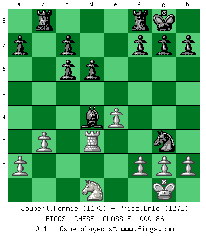 Last move : 0-1 2017 February 13 8:54:41 [Event "FICGS__CHESS__CLASS_F__000186"] [Site "FICGS"] [Date "2017.01.31"] [Round "1"] [White "Joubert,Hennie"] [Black "Price,Eric"] [Result "0-1"] [WhiteElo "1173"] [BlackElo "1273"] 1.e4 e5 2.Nf3 Nc6 3.Bc4 Nf6 4.d4 exd4 5.O-O d6 6.c3 dxc3 7.Qb3 Qd7 8.Nxc3 Na5 9.Qb4 Nxc4 10.Qxc4 Be7 11.Bf4 O-O 12.Rfe1 Qc6 13.Qxc6 bxc6 14.Rad1 Bg4 15.Re3 Nh5 16.Bg3 Rab8 17.b3 Bf6 18.Nd4 Bxd1 19.Nxd1 Bxd4 20.Rd3 Nxg3 0-1 Two knights defense Kingside Castling by player White (move 5) Kingside Castling by player Black (move 11) Player Black won this chess game. Follow this game move after move (download)Personally, I rather look forward to a computer program winning the world Chess Championship. Humanity needs a lesson in humility. (Richard Dawkings) Im Internet Chess Club betrug mein Rating vorübergehend 3350 ELO-Punkte. (Sergej Karjakin) El Ajedrez es una manera fabulosa para que los niños aprendan a autovalorarse y a autoestimarse. (Saudin Robovic) Même un GMI sait rarement calculer sur plus de cinq coups une attaque à sacrifices. (Rudolf Spielmann) Patience, use the Force, think ! (Obi-Wan Kenobi in Star Wars ep.2)