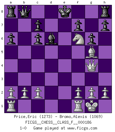 Last move : 1-0 2017 February 5 21:34:39 [Event "FICGS__CHESS__CLASS_F__000186"] [Site "FICGS"] [Date "2017.01.31"] [Round "1"] [White "Price,Eric"] [Black "Bromo,Alexis"] [Result "1-0"] [WhiteElo "1273"] [BlackElo "1069"] 1.e4 e5 2.Nf3 Nc6 3.Bb5 d6 4.O-O Bd7 5.d4 a6 6.Bxc6 Bxc6 7.dxe5 dxe5 8.Nc3 Nf6 9.Nxe5 Nxe4 10.Nxc6 bxc6 11.Nxe4 Bd6 12.Qg4 g6 13.Bg5 Qb8 14.Nf6+ 1-0 Ruy Lopez : Old Steinitz defense Kingside Castling by player White (move 4) Player White won this chess game. Follow this game move after move (download)Checkers is for tramps. (Paul Morphy) Wenn Capablanka heute auf der Schachbühne erscheinen würde, hätte er ein halbes Jahr gebraucht um sich die Schachtheorie anzueignen. Und dann hätte er alles und jeden besiegt. (Mikhail Moiseyevich Botvinik) La vida es como un juego de Ajedrez, cambiando con cada movimiento. (Proverbio Chino) Psychologiquement, tu dois avoir confiance en toi même, mais cette confiance doit être basée sur des faits. (Robert Fischer) What doesn't kill us makes us stronger. (Friedrich Nietzsche)