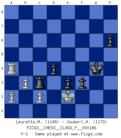 Last move : 0-1 2017 March 7 21:8:57 [Event "FICGS__CHESS__CLASS_F__000186"] [Site "FICGS"] [Date "2017.01.31"] [Round "1"] [White "Leurette,Marc-Antoine"] [Black "Joubert,Hennie"] [Result "0-1"] [WhiteElo "1148"] [BlackElo "1173"] 1.e4 c5 2.Nc3 Nc6 3.Nf3 e6 4.d4 cxd4 5.Nxd4 Nf6 6.Nxc6 bxc6 7.e5 Nd5 8.Nxd5 cxd5 9.b3 d6 10.Bb5+ Bd7 11.Bxd7+ Qxd7 12.Bb2 dxe5 13.Bxe5 f6 14.Bb2 Qb5 15.Qd2 Rc8 16.O-O-O Bb4 17.Qe3 e5 18.Qd3 Qxd3 19.Rxd3 d4 20.f3 Kf7 21.g4 h6 22.h4 Rc7 23.h5 Rhc8 24.Rh2 Bc3 25.Bxc3 Rxc3 26.Rxc3 Rxc3 27.Rf2 g6 28.Kd2 gxh5 29.gxh5 Ke6 30.f4 e4 31.Re2 Kf5 32.Rg2 Kxf4 33.Rf2+ Kg5 34.Rg2+ Kxh5 35.Rg7 f5 36.Rxa7 f4 37.Ra5+ Kg4 38.Ra4 e3+ 39.Ke2 f3+ 0-1 Sicilian : Closed, 2...Nc6 Queenside Castling by player White (move 16) Player Black won this chess game. Follow this game move after move (download)Live, lose, and learn, by observing your opponent how to win. (Amber Steenbock) Schach ist mein Leben, meine Leidenschaft, was ich gelernt habe und seit meinem 14. Lebensjahr profimässig praktiziere. Darauf zu verzichten, würde mir sehr schwer fallen. (Viktor Kortschnoi) El Ajedrez es una hermosa aventura. (Bent Larsen) Il vaut mieux sacrifier les pièces de l'adversaire. (Xavier Tartacover) He who laughs last probably does not get the joke. (Unknown)