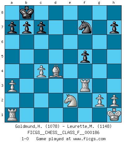 Last move : 1-0 2017 March 4 13:51:37 [Event "FICGS__CHESS__CLASS_F__000186"] [Site "FICGS"] [Date "2017.01.31"] [Round "1"] [White "Goldmund,Heike"] [Black "Leurette,Marc-Antoine"] [Result "1-0"] [WhiteElo "1078"] [BlackElo "1148"] 1.b4 e5 2.Bb2 Bxb4 3.f4 d6 4.fxe5 dxe5 5.Bxe5 Nc6 6.Bxg7 Be6 7.Bxh8 Qd7 8.a3 Ba5 9.Nf3 O-O-O 10.Bb2 Nge7 11.e3 f5 12.Ng5 Ng6 13.Nxe6 Qxe6 14.Be2 Kb8 15.O-O Bb6 16.c4 Rh8 17.Bxh8 Nce5 18.d4 Nf7 19.Bg7 Qxe3+ 20.Kh1 Nf4 21.Rf3 Qe4 22.Nc3 Qxd4 23.Qxd4 Bxd4 24.Bxd4 Nxe2 25.Nxe2 1-0 Polish (Sokolsky) opening Queenside Castling by player Black (move 9) Kingside Castling by player White (move 15) Player White won this chess game. Follow this game move after move (download)To avoid losing a piece, many a person has lost the game. (Savielly Tartakover) Auf Remis zu spielen ist gewissermaßen ein Verbrechen gegen das Schachspiel. (Mikhail Nekhemyevich Tal) La caracteristica mas importante en la posición del Ajedrez es la actividad de las piezas. Esto es absolutamente fundamental en todas las fases del juego: Apertura, Juego Medio y especialmente Finales. La limitación primordial en la actividad de una pieza, es la estructuración de los Peones. (Michael Stean) C'est une question de caractère, Beaucoup de gens perdent leur motivation très vite. D'autres, ils sont rares, peuvent la conserver très longtemps. J'aime les échecs, encore aujourd'hui je suis heureux d'analyser des parties. J'aime toujours gagner, je déteste encore perdre. Bien jouer est important pour mon intégrité intellectuelle et morale. Et puis les échecs vivent en ce moment une période historique grâce à Internet. Ils se développent dans les systèmes éducatifs à travers le monde. Ils sortent de leur ghetto, et c'est mon rôle de mener à bien cette révolution. (Gary Kasparov) Perception is reality. (Immanuel Kant)