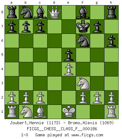 Last move : 1-0 2017 March 9 19:36:14 [Event "FICGS__CHESS__CLASS_F__000186"] [Site "FICGS"] [Date "2017.01.31"] [Round "1"] [White "Joubert,Hennie"] [Black "Bromo,Alexis"] [Result "1-0"] [WhiteElo "1173"] [BlackElo "1069"] 1.e4 e5 2.Nf3 d6 3.Bc4 h6 4.d4 Nf6 5.dxe5 dxe5 6.Bxf7+ Kxf7 7.Qxd8 1-0 Philidor's defense Player White won this chess game. Follow this game move after move (download)No Chess Grandmaster is normal; they only differ in the extent of their madness. (Viktor Korchnoi) Es war undenkbar für die Behörden, dass ein sowjetischer Großmeister auf diese Art und Weise [Fischer-Taimanov 6:0] verliert, ohne dass es eine politischer Erklärung dafür gäbe. (Mark Taimanov) Nunca antes ha habido un jugador de Ajedrez con tal conocimiento a fondo de las complejidades del juego y una inmensa voluntad absolutamente indomable de ganar. Yo pienso que Fischer es el jugador mas grande que jamás haya existido. (Lisa Lane) J'apprécie les joueurs d'est-indienne, c'est grâce à eux que je nourris ma famille depuis tant d'années. (Petrosian) No enterprise is more likely to succeed than one concealed from the enemy until it is ripe for execution. (Niccolo Machiavelli)