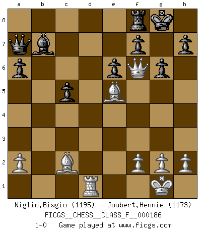 Last move : 1-0 2017 March 6 20:24:27 [Event "FICGS__CHESS__CLASS_F__000186"] [Site "FICGS"] [Date "2017.01.31"] [Round "1"] [White "Niglio,Biagio"] [Black "Joubert,Hennie"] [Result "1-0"] [WhiteElo "1195"] [BlackElo "1173"] 1.e4 c5 2.d4 cxd4 3.c3 dxc3 4.Nxc3 Nc6 5.Nf3 e6 6.Bc4 Nf6 7.O-O d6 8.Qe2 a6 9.Rd1 Qc7 10.Bf4 Be7 11.Rac1 O-O 12.Bb3 Qb8 13.e5 dxe5 14.Nxe5 Nxe5 15.Bxe5 Qa7 16.Ne4 b6 17.Rc7 Bb7 18.Rxe7 Nxe4 19.Bc2 Nc5 20.b4 Rae8 21.Rxe8 Rxe8 22.bxc5 bxc5 23.Qg4 g6 24.Qh4 Rf8 25.Qf6 1-0 Sicilian : Smith-Morra gambit Kingside Castling by player White (move 7) Kingside Castling by player Black (move 11) Player White won this chess game. Follow this game move after move (download)All Chess players should have a hobby. (Savielly Tartakower) Im Reiche der Wirklichkeit ist man nie so glücklich wie im Reiche der Gedanken. (Arthur Schopenhauer) Hoy en día, si tu no eres un Gran Maestro a los 14 años, es mejor que lo olvides. (Anand Viswanathan) Le thème de l'attaque double intervient d'une manière ou d'une autre dans l'immense majorité des combinaisons. (Youri Averbakh) Those parts of the system that you can hit with a hammer (not advised) are called hardware; those program instructions that you can only curse at are called software. (Anonymous)
