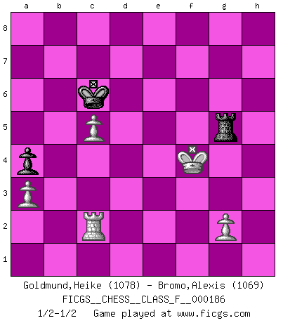 Last move : 1/2-1/2 2017 August 21 8:14:40 [Event "FICGS__CHESS__CLASS_F__000186"] [Site "FICGS"] [Date "2017.01.31"] [Round "1"] [White "Goldmund,Heike"] [Black "Bromo,Alexis"] [Result "1/2-1/2"] [WhiteElo "1078"] [BlackElo "1069"] 1.e4 e5 2.Nf3 Nc6 3.Bc4 h6 4.c3 Nf6 5.d3 d6 6.O-O Be7 7.Be3 a6 8.Qb3 O-O 9.Nbd2 b5 10.Bd5 Nxd5 11.Qxd5 Bb7 12.Nh4 Bxh4 13.Nf3 Bf6 14.h3 Qc8 15.Nh2 Ne7 16.Qb3 c6 17.Ng4 Bg5 18.a3 a5 19.Qd1 Ng6 20.d4 exd4 21.Bxd4 c5 22.Be3 Nf4 23.Qxd6 Bxe4 24.Bxf4 Bxf4 25.Qxf4 Re8 26.Rfe1 Qc6 27.f3 Bd5 28.Ne3 Rad8 29.Nxd5 Rxd5 30.Re4 Rxe4 31.Qxe4 f5 32.Qe3 Kh7 33.Re1 Qf6 34.b3 f4 35.Qe4+ Rf5 36.Qd3 c4 37.bxc4 bxc4 38.Qxc4 h5 39.Re6 Qd8 40.Qe4 g6 41.Re7+ Kh6 42.c4 Kg5 43.Kf2 Qd2+ 44.Qe2 Qxe2+ 45.Rxe2 Rc5 46.Rc2 Kf5 47.Ke2 g5 48.Kd3 Ke5 49.Re2+ Kd6 50.Kd4 a4 51.Rb2 g4 52.hxg4 hxg4 53.fxg4 Rg5 54.Rc2 Rxg4 55.c5+ Kc6 56.Ke5 Rg5+ 57.Kxf4 Rd5 58.Ke4 Rg5 59.Kf4 Rd5 60.Ke4 Rg5 61.Kf4 1/2-1/2 King's pawn game Kingside Castling by player White (move 6) Kingside Castling by player Black (move 8) 10 pieces endgame at move 53 : White KRPPPP , Black KRPP WHITE : King + 1 Rook 4 Pawns BLACK : King + 1 Rook 2 Pawns 9 pieces endgame at move 54 : White KRPPP , Black KRPP WHITE : King + 1 Rook 3 Pawns BLACK : King + 1 Rook 2 Pawns 8 pieces endgame at move 57 : White KRPPP , Black KRP WHITE : King + 1 Rook 3 Pawns BLACK : King + 1 Rook 1 Pawn This chess game ended in a draw. Follow this game move after move (download)In complicated positions, Bobby Fischer hardly had to be afraid of anybody. (Paul Keres) Es ist wirklich schade, dass so viele Schachspieler nicht auf ihr Äußeres achten! (Alexandra Kosteniuk) Si un gobernante no entiende al Ajedrez, ¿como puede governar él un reinado?. (El Rey Khusros II) D'abord les bases : Jouez et étudiez, puis étudiez et jouez, ensuite jouez et étudiez, puis étudiez et jouez. Deuxièmement : Donnez toujours le meilleur de vous-même ! (Ken Smith) Vladimir Ras-Putin is still alive... He is also a good actor, I saw him in the Lord of the Rings. (Rodolfo d'Ettorre)
