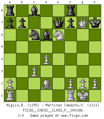 Last move : 1-0 2017 March 15 16:33:47 [Event "FICGS__CHESS__CLASS_F__000186"] [Site "FICGS"] [Date "2017.01.31"] [Round "1"] [White "Niglio,Biagio"] [Black "Martinez Camacho,Victor Hugo"] [Result "1-0"] [WhiteElo "1195"] [BlackElo "1111"] 1.e4 c6 2.d4 d5 3.exd5 cxd5 4.c4 e6 5.Nc3 Nf6 6.Nf3 Bb4 7.cxd5 Nxd5 8.Bd2 Nxc3 9.bxc3 Bd6 10.Bd3 Nc6 11.O-O O-O 12.Bxh7+ Kxh7 13.Ng5+ Kg6 14.Qg4 Qe7 15.Nxe6 Kh7 16.Qxg7+ 1-0 Caro-Kann : Panov-Botvinnik attack Kingside Castling by player White (move 11) Kingside Castling by player Black (move 11) Player White won this chess game. Follow this game move after move (download)Bobby is the most misunderstood, misquoted celebrity walking the face of this earth. (Yasser Seirawan) Der Verteidiger gebe der Gewalt nach, aber nur der Gewalt. Er schaffe sich nicht freiwillig, etwa aus Blindheit oder aus Schrecken, irgendwelche Schwächen. Er lasse sich nicht bluffen. (Emanuel Lasker) El juego del Ajedrez no es solamente una diversión quieta; algunas cualidades muy valuables de la mente se pueden adquirir y cultivar con el, como convertirlos en habitos disponibles para toda ocasión; ya que la vida es algo así como el Ajedrez. (Benjamin Franklin) Le pion, dans sa simplicité, marche droit devant lui, mais lorsqu'il prend, il le fait obliquement? Ainsi l'homme, tant qu'il reste pauvre, marche dans la droiture et vit honnêtement, mais lorsqu'il recherche les honneurs, il flatte, se parjure et, par les voies obliques, cherche une position supérieure sur l'échiquier du monde. (Jean de Galles) I'm extremely disappointed. I send you out for exciting, new designer drugs, you come back with tomato sauce. (Gregory House, House M.D.)