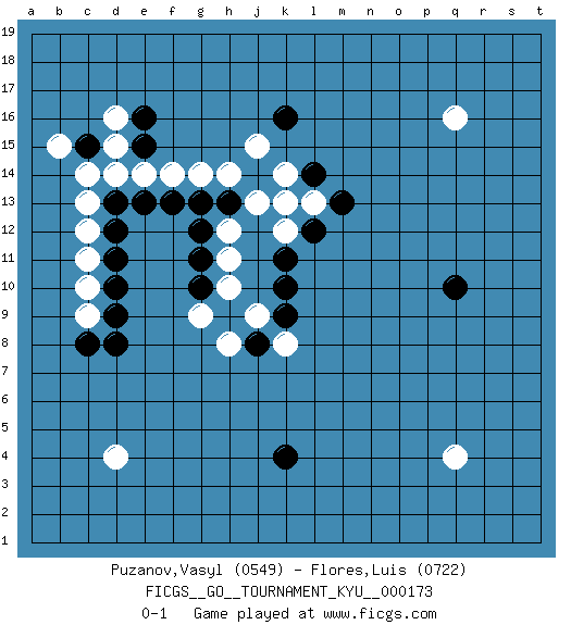 Last move : 0-1 2017 May 17 0:52:27 [Event "FICGS__GO__TOURNAMENT_KYU__000173"] [Site "FICGS"] [Date "2017.02.02"] [Round "1"] [Black "Puzanov,Vasyl"] [White "Flores,Luis"] [Result "0-1"] [Rating 1 "0549"] [Rating 2 "0722"] 1.k10 q16 2.q10 q4 3.k4 d4 4.d10 d16 5.k16 c11 6.d11 c10 7.d9 c9 8.c8 c12 9.d12 c13 10.d13 c14 11.c15 d14 12.e15 d15 13.e16 e14 14.d8 b15 15.e13 f14 16.f13 g14 17.g13 h14 18.h13 j13 19.j14 j15 20.k13 k14 21.l14 l13 22.m13 k12 23.l12 k13 24.k11 h12 25.g12 h11 26.g11 h10 27.g10 g9 28.h9 j9 29.k9 h8 30.j8 k8 0-1 Here are the names of the openings (joseki) played in the four corners : Corner d4 : d4 d9 Hoshi (Hwajeom, Seongjeom, Xingwei`) 4-4 Point. The star or hoshi (4-4) point, emphasizing influence at the potential expense of territory. Corner q16 : q16 l14 Hoshi (Hwajeom, Seongjeom, Xingwei`) 4-4 Point. The star or hoshi (4-4) point, emphasizing influence at the potential expense of territory. Player White won this Go (weiqi, baduk) game. Follow this game move after move (download)Everything happens on a grid-engraved board with black and white pieces, but if that's all you see then you don't know Go. (Pierre Audouard) Logic : The art of thinking and reasoning in strict accordance with the limitations and incapacities of the human misunderstanding. (Ambrose Bierce)