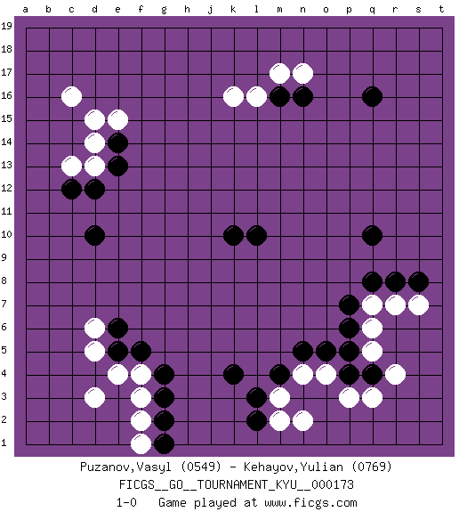 Last move : 1-0 2017 July 18 0:6:16 [Event "FICGS__GO__TOURNAMENT_KYU__000173"] [Site "FICGS"] [Date "2017.02.02"] [Round "1"] [Black "Puzanov,Vasyl"] [White "Kehayov,Yulian"] [Result "1-0"] [Rating 1 "0549"] [Rating 2 "0769"] 1.q16 r4 2.q10 d5 3.k10 c16 4.k4 k16 5.d10 p3 6.q4 q3 7.p4 o4 8.o5 n4 9.n5 m3 10.m4 n2 11.l3 m2 12.l2 q5 13.p5 q6 14.p6 q7 15.p7 f4 16.f5 e4 17.e5 d6 18.e6 d3 19.g4 f3 20.g3 f2 21.g2 n17 22.n16 m17 23.m16 l16 24.q8 r7 25.g1 f1 26.l10 d13 27.d12 c13 28.c12 e15 29.e14 d14 30.e13 d15 31.r8 s7 32.s8 1-0 This go game has been lost on time (started : 2017.02.02 13:41:59) Here are the names of the openings (joseki) played in the four corners : Corner q16 : q16 n17 Hoshi (Hwajeom, Seongjeom, Xingwei`) 4-4 Point. The star or hoshi (4-4) point, emphasizing influence at the potential expense of territory. Niken Kakari (Dukan Keolch'im, E`r Gua`jiao~, 2-Space Low Approach). Black typically answers by 7-3 or 3-5 (which is not joseki). Player Black won this Go (weiqi, baduk) game. Follow this game move after move (download)If a formation is symmetrical, play at the center. (Anonymous) If you have any trouble condescending, find a Unix user to show you how it's done. (Scott Adams)