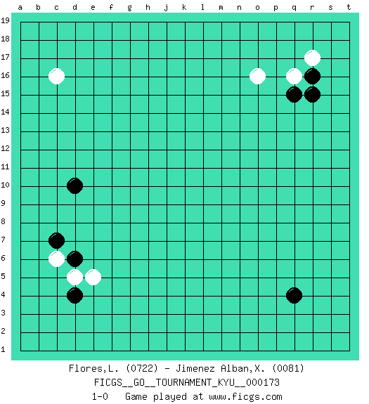 Last move : 1-0 2017 March 25 20:47:51 [Event "FICGS__GO__TOURNAMENT_KYU__000173"] [Site "FICGS"] [Date "2017.02.02"] [Round "1"] [Black "Flores,Luis"] [White "Jimenez Alban,Xavier Miguel"] [Result "1-0"] [Rating 1 "0722"] [Rating 2 "0081"] 1.d4 q16 2.q4 c16 3.r16 r17 4.r15 o16 5.q15 c6 6.d10 e5 7.d6 d5 8.c7 1-0 This go game has been lost on time (started : 2017.02.02 13:41:59) Here are the names of the openings (joseki) played in the four corners : Corner q16 : q16 r16 Hoshi (Hwajeom, Seongjeom, Xingwei`) 4-4 Point. The star or hoshi (4-4) point, emphasizing influence at the potential expense of territory. Corner d4 : d4 c6 Hoshi (Hwajeom, Seongjeom, Xingwei`) 4-4 Point. The star or hoshi (4-4) point, emphasizing influence at the potential expense of territory. Ikken Kakari (Hankan Keolch'im, Yi Gua`jiao~, 1-Space Low Approach). White 2 is the standard approach move to the 4-4. Player Black won this Go (weiqi, baduk) game. Follow this game move after move (download)Dead group ? Always win ko fights ! (Anonymous) The real voyage of discovery consists not in seeking new lands but in seeing with new eyes. (Marcel Proust)