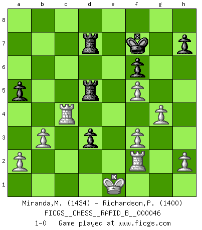Last move : 1-0 2007 May 6 4:42:42 [Event "FICGS__CHESS__RAPID_B__000046"] [Site "FICGS"] [Date "2007.04.03"] [Round "1"] [White "Miranda,Marcus"] [Black "Richardson,Patrick"] [Result "1-0"] [WhiteElo "1434"] [BlackElo "1400"] 1.d4 Nf6 2.c4 e6 3.Nf3 d5 4.Nc3 Bb4 5.e3 O-O 6.Bd3 b6 7.O-O Ba6 8.cxd5 Bxd3 9.Qxd3 exd5 10.Ne5 Re8 11.b3 Bxc3 12.Qxc3 Qd6 13.f3 c5 14.Bb2 Nc6 15.Rac1 Rac8 16.Qd2 Qe7 17.Rfd1 Nb4 18.Bc3 Nc6 19.Nxc6 Rxc6 20.dxc5 bxc5 21.Bxf6 gxf6 22.Kf1 Rd8 23.Qa5 f5 24.Rc2 Rc7 25.Rcd2 Rcd7 26.Qc3 f4 27.exf4 d4 28.Qc4 Rd5 29.g3 Qd6 30.Re1 d3 31.Kf2 Rd4 32.Qc3 f6 33.Re4 Rd5 34.Qc4 Kf8 35.Re3 Qd7 36.Qe4 Rd4 37.Qe6 Rd6 38.Qxd7 R8xd7 39.g4 Kf7 40.f5 Rd4 41.Re4 R4d5 42.Ke1 a5 43.Rf2 c4 44.Rxc4 1-0 Queen's pawn game Kingside Castling by player Black (move 5) Kingside Castling by player White (move 7) Player White won this chess game. Follow this game move after move (download)No Chess Grandmaster is normal; they only differ in the extent of their madness. (Viktor Korchnoi) Sie bekommen vielleicht den Eindruck, dass die Spitzenspieler überhaupt gar nicht so stark sind. Aber das stimmt nicht. Es ist eine Illusion. Mit einem Computer an der Seite ist es sehr leicht, Urteile zu fällen, aber wenn man alleine am Brett sitzt, sieht die Sache ganz anders aus. (Vladimir Kramnik) El Ajedrez es despiadado: debes de estar preparado para matar gente. (Nigel Short) 'L'échange des dames est un coup dur pour les deux adversaires...' Un journaliste lors d'une partie du match Spassky-Fischer Follow your passion, and success will follow you. (Arthur Buddhold)