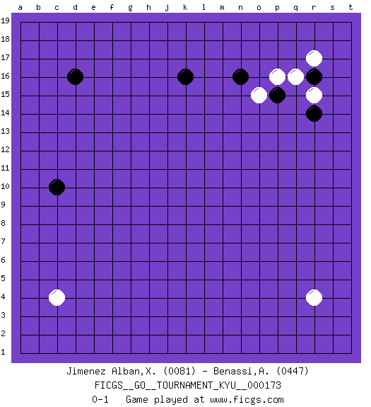 Last move : 0-1 2017 March 12 19:44:54 [Event "FICGS__GO__TOURNAMENT_KYU__000173"] [Site "FICGS"] [Date "2017.02.02"] [Round "1"] [Black "Jimenez Alban,Xavier Miguel"] [White "Benassi,Aspasio"] [Result "0-1"] [Rating 1 "0081"] [Rating 2 "0447"] 1.d16 r4 2.r16 c4 3.c10 p16 4.r14 r17 5.k16 q16 6.n16 r15 7.p15 o15 0-1 This go game has been lost on time (started : 2017.02.02 13:41:59) Here are the names of the openings (joseki) played in the four corners : Corner q16 : r16 p16 Komoku (Somok, Xiao~mu`) 3-4 Point. The komoku (3-4) point is the traditional corner enclosure move.. Ikken Takagakari (Hankan Nop'dakeolch'im, Yi Gaogua`jiao~, 1-Space High Approach). The 5-4 approach move has become more popular in modern times, as modern Go emphasizes speed and influence. Corner q4 : r4 0-1 Komoku (Somok, Xiao~mu`) 3-4 Point. The komoku (3-4) point is the traditional corner enclosure move.. Player White won this Go (weiqi, baduk) game. Follow this game move after move (download)Only amateurs try to come up with fancy moves. (Anonymous) Perhaps chess is the wrong game for the times (The Chess Master and the Computer, by Garry Kasparov - 2010)