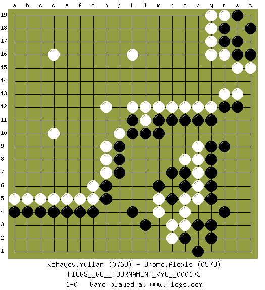 Last move : 1-0 2017 July 18 0:6:16 [Event "FICGS__GO__TOURNAMENT_KYU__000173"] [Site "FICGS"] [Date "2017.02.02"] [Round "1"] [Black "Kehayov,Yulian"] [White "Bromo,Alexis"] [Result "1-0"] [Rating 1 "0769"] [Rating 2 "0573"] 1.c4 q16 2.q3 d16 3.r9 d10 4.k4 k16 5.k10 h12 6.o7 l11 7.l10 j10 8.k11 k12 9.m11 l12 10.m10 m12 11.n11 n12 12.o11 o12 13.p11 p12 14.q11 q12 15.r12 r13 16.s12 s13 17.j9 h9 18.j8 h8 19.j7 h7 20.h6 g6 21.h5 g5 22.g4 f5 23.f4 e5 24.e4 d5 25.d4 c5 26.b4 b5 27.a4 a5 28.r17 r16 29.s17 q17 30.r18 q18 31.s16 s15 32.t16 t15 33.t18 r19 34.s19 q19 35.r4 n3 36.l3 o3 37.p3 p2 38.q2 m4 39.o2 n2 40.p1 o4 41.n5 m5 42.m6 o5 43.o6 p5 44.q5 p6 45.q6 p7 46.q7 p8 47.q8 p9 48.q9 o8 49.n7 1-0 This go game has been lost on time (started : 2017.02.02 13:41:59) Here are the names of the openings (joseki) played in the four corners : Player Black won this Go (weiqi, baduk) game. Follow this game move after move (download)In an unreasonable situation, an unreasonable move is reasonable. (Tamino) Question: Is 'This statement is paradoxical' a paradoxical statement ? Or is it a meta-paradox ? (Normajean Yates)