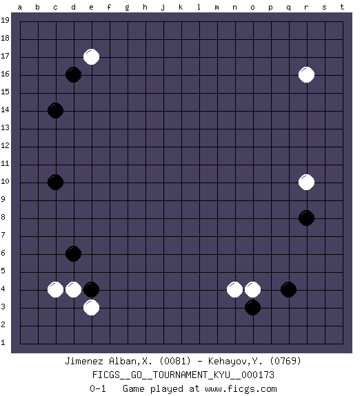 Last move : 0-1 2017 May 5 2:37:49 [Event "FICGS__GO__TOURNAMENT_KYU__000173 "] [Site "FICGS"] [Date "2017.02.02"] [Round "1"] [Black "Jimenez Alban,Xavier Miguel "] [White "Kehayov,Yulian "] [Result "0-1"] [Rating 1 "0081"] [Rating 2 "0769"] 1.d16 r16 2.q4 c4 3.c10 r10 4.d6 e17 5.c14 o4 6.o3 n4 7.e4 e3 8.r8 d4 0-1 This go game has been lost on time (started : 2017.02.02 13:41:59) Here are the names of the openings (joseki) played in the four corners : Corner d4 : c4 d6Komoku (Somok, Xiao~mu`) 3-4 Point. The komoku (3-4) point is the traditional corner enclosure move.. Corner d16 : d16 e17Hoshi (Hwajeom, Seongjeom, Xingwei`) 4-4 Point. The star or hoshi (4-4) point, emphasizing influence at the potential expense of territory. Corner q4 : q4 o4Hoshi (Hwajeom, Seongjeom, Xingwei`) 4-4 Point. The star or hoshi (4-4) point, emphasizing influence at the potential expense of territory.Ikken Takagakari (Hankan Nop'dakeolch'im, Yi Gaojia, 1-Space High Approach). Black typically responds at 6-4 or 3-10. Black 4-10 is played when Black finds play on the right side advantageous. Black 4-8 or 3-8 may be played when Black has support at top. Player White won this Go (weiqi, baduk) game.Follow this game move after move (download ) Don't make empty triangles. (Anonymous) Don't be discouraged. It's often the last key in the bunch that opens the lock. (Author unknown)
