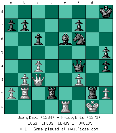 Last move : 0-1 2017 February 24 10:36:11 [Event "FICGS__CHESS__CLASS_E__000195"] [Site "FICGS"] [Date "2017.02.02"] [Round "1"] [White "Usan,Kavi"] [Black "Price,Eric"] [Result "0-1"] [WhiteElo "1234"] [BlackElo "1273"] 1.e4 e5 2.Nf3 Nc6 3.Nc3 Nf6 4.Bb5 Nd4 5.d3 Bb4 6.Bd2 Bxc3 7.Bxc3 Nxb5 8.Bxe5 c6 9.c4 Nc7 10.O-O d6 11.Bg3 O-O 12.Ng5 Ne6 13.Re1 Nxg5 14.Bh4 Ne6 15.d4 g5 16.d5 gxh4 17.dxe6 Bxe6 18.b3 h5 19.Re3 Kh7 20.e5 dxe5 21.Qc2+ Kh8 22.Rxe5 Qd4 23.R5e1 Rg8 24.Rad1 Qg4 25.f3 Qf4 26.Qc3 Rad8 27.Rb1 Rd2 28.Rb2 R8xg2+ 0-1 Four knights : Rubinstein counter-gambit Kingside Castling by player White (move 10) Kingside Castling by player Black (move 11) Player Black won this chess game. Follow this game move after move (download)Chess is like war on a board. (Bobby Fischer) Spielt Blackmar-Diemer-Gambit, und das Matt kommt von selbst! (Emil Joseph Diemer) El jugador blanco perdió porque fallo en recordar la coreccta continuación y tuvo que pensar por sí mismo las movidas. (Siegbert Tarrasch) C'est une question de caractère, Beaucoup de gens perdent leur motivation très vite. D'autres, ils sont rares, peuvent la conserver très longtemps. J'aime les échecs, encore aujourd'hui je suis heureux d'analyser des parties. J'aime toujours gagner, je déteste encore perdre. Bien jouer est important pour mon intégrité intellectuelle et morale. Et puis les échecs vivent en ce moment une période historique grâce à Internet. Ils se développent dans les systèmes éducatifs à travers le monde. Ils sortent de leur ghetto, et c'est mon rôle de mener à bien cette révolution. (Gary Kasparov) When the going gets tactical, the computers get going. (Hyatt)