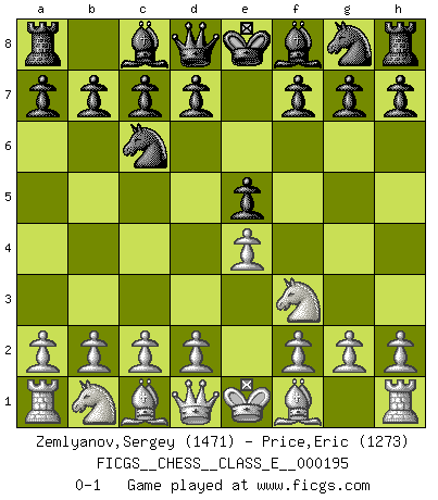 Last move : 0-1 2017 March 15 20:8:46 [Event "FICGS__CHESS__CLASS_E__000195"] [Site "FICGS"] [Date "2017.02.02"] [Round "1"] [White "Zemlyanov,Sergey"] [Black "Price,Eric"] [Result "0-1"] [WhiteElo "1471"] [BlackElo "1273"] 1.e4 e5 2.Nf3 Nc6 0-1 This chess game has been lost on time (started : 2017.02.02 23:36:44) King's pawn game Player Black won this chess game. Follow this game move after move (download)The combination player thinks forward; he starts from the given position, and tries the forceful moves in his mind. (Emanuel Lasker) Verschiedene, sehr schätzbare und im Laufe des Lebens nützliche Eigenschaften des Geistes können durch das Schachspiel erworben und gekräftigt werden, so dass sie zu Gewohnheiten werden, die uns nie im Stich lassen. (Benjamin Franklin) Nos gusta pensar. (Gary Kasparov) Les échecs sont utiles à l'exercice de la faculté de penser et à celle de l'imagination. Car nous devons posséder une méthode élaborée pour atteindre des buts partout où nous devons conduire notre raison. (Leibnitz) A generalist learns less and less about more and more until he knows nothing about everything. (Author unknown)