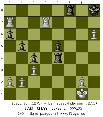 Last move : 1-0 2017 February 6 0:47:7 [Event "FICGS__CHESS__CLASS_E__000195"] [Site "FICGS"] [Date "2017.02.02"] [Round "1"] [White "Price,Eric"] [Black "Barradas,Anderson"] [Result "1-0"] [WhiteElo "1273"] [BlackElo "1292"] 1.e4 e5 2.Nf3 Nc6 3.Bb5 Nf6 4.O-O a6 5.Ba4 b5 6.Bb3 Bb7 7.d3 Bc5 8.c3 O-O 9.Bg5 h6 10.Bh4 g5 11.Bg3 d6 12.Nbd2 Ne7 13.Re1 Ng6 14.Nf1 Ba7 15.Ne3 c5 16.Nf5 Kh7 17.h4 Nf4 18.hxg5 N6h5 19.Bh4 Ng6 20.gxh6 Nxh4 21.N3xh4 Qg5 22.Kf1 Bc8 23.Bd5 Rb8 24.Re3 c4 25.Rh3 Qf4 26.d4 Nf6 27.Rf3 Qg5 28.Rg3 Qf4 29.Rg7+ Kh8 30.Bxf7 Bxf5 31.Nxf5 Nxe4 32.Qc2 Qxf5 33.Bg6 Qxf2+ 34.Qxf2 Rxf2+ 35.Kg1 Rf4 36.Rxa7 Rbf8 37.dxe5 dxe5 38.Bxe4 Rxe4 39.Rf1 R8f4 40.Rd1 Rf8 41.R1d7 1-0 Ruy Lopez : Berlin defense, 4.O-O Kingside Castling by player White (move 4) Kingside Castling by player Black (move 8) Player White won this chess game. Follow this game move after move (download)Those who say they understand Chess, understand nothing. (Robert Hubner) Besser ein falscher Plan, logisch durchgeführt, als gar kein Plan. (Viktor Kortschnoi) Tu no necesitas jugar muy bien, únicamente ayudar a tu oponenet a que juegue muy mal. (Genrikh Chepukaitis) Une platitude souvent récitée à propos des Echecs est qu'une des choses les plus difficiles à réaliser est de gagner une position gagnante. Cela ne manque pas de sens mais, pour ma part, j'ai toujours trouvé plus difficile de gagner une position perdante. (Tim Krabbe) Always two there are. No more no less. A master, and an apprentice. (Master Yoda in Star Wars ep.1)