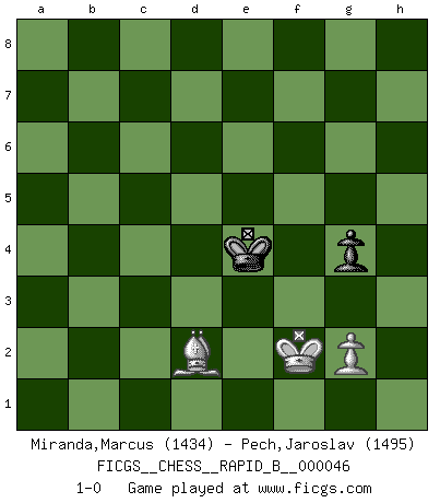 Last move : 1-0 2007 August 9 23:33:15 [Event "FICGS__CHESS__RAPID_B__000046"] [Site "FICGS"] [Date "2007.04.03"] [Round "1"] [White "Miranda,Marcus"] [Black "Pech,Jaroslav"] [Result "1-0"] [WhiteElo "1434"] [BlackElo "1495"] 1.e4 e6 2.d4 d5 3.exd5 exd5 4.Nf3 Nf6 5.Bd3 Be7 6.O-O Bg4 7.Re1 O-O 8.c3 Nbd7 9.h3 Bh5 10.Bf4 c5 11.Nbd2 Re8 12.Qc2 Qb6 13.Ne5 Nf8 14.Be3 Ne6 15.Ndf3 Rad8 16.dxc5 Bxc5 17.Ng5 Nxg5 18.Bxg5 Bg6 19.Rad1 Qd6 20.Bxg6 hxg6 21.Nd3 Bb6 22.Qa4 Qc6 23.Qxc6 bxc6 24.Kf1 Rc8 25.Bf4 Ne4 26.f3 Nc5 27.Nxc5 Bxc5 28.Rxe8+ Rxe8 29.Re1 Rxe1+ 30.Kxe1 Bb6 31.Kd2 a5 32.Bd6 f5 33.b4 Kf7 34.bxa5 Bxa5 35.Kd3 Ke6 36.Bf8 Kf6 37.a4 g5 38.c4 g6 39.cxd5 cxd5 40.Kd4 Ke6 41.Kc5 Be1 42.Kb5 d4 43.Kc4 Ke5 44.Bg7+ Kf4 45.Bxd4 Ba5 46.Bf2 Bd2 47.Kb5 g4 48.fxg4 fxg4 49.hxg4 Kxg4 50.a5 Bxa5 51.Kxa5 Kf4 52.Kb4 g5 53.Kc3 Ke4 54.Kd2 Kf4 55.Ke2 g4 56.Be1 Kf5 57.Bd2 Ke4 58.Kf2 1-0 French : Exchange variation Kingside Castling by player White (move 6) Kingside Castling by player Black (move 7) 10 pieces endgame at move 48 : White KBPPPP , Black KBPP WHITE : King + 1 Bishop 4 Pawns BLACK : King + 1 Bishop 2 Pawns 9 pieces endgame at move 48 : White KBPPP , Black KBPP WHITE : King + 1 Bishop 3 Pawns BLACK : King + 1 Bishop 2 Pawns 8 pieces endgame at move 49 : White KBPPP , Black KBP WHITE : King + 1 Bishop 3 Pawns BLACK : King + 1 Bishop 1 Pawn 7 pieces endgame at move 49 : White KBPP , Black KBP WHITE : King + 1 Bishop 2 Pawns BLACK : King + 1 Bishop 1 Pawn 6 pieces endgame at move 50 : White KBP , Black KBP WHITE : King + 1 Bishop 1 Pawn BLACK : King + 1 Bishop 1 Pawn 5 pieces endgame at move 51 : White KBP , Black KP WHITE : King + 1 Bishop 1 Pawn BLACK : King + 1 Pawn Player White won this chess game. Follow this game move after move (download)Good positions don't win games, good moves do. (Gerald Abrahams) Ein guter Spieler hat immer Glück. (José Raúl Capablanca) Un sacrificio se refuta mucho mejor al aceptarlo. (Wilhelm Steinitz) À la honte des hommes, on sait que les lois du jeu sont les seules qui soient partout justes, claires, inviolables et exécutées. Pourquoi l'Indien qui a donné les règles du jeu d'échecs est-il obéi de bon gré dans toute la terre, et que les décrétales des papes, par exemple, sont aujourd'hui un objet d'horreur et de mépris ? C'est que l'inventeur des échecs combina tout avec justesse pour la satisfaction des joueurs, et que les papes, dans leurs décrétales, n'eurent en vue que leur seul avantage. L'Indien voulut exercer également l'esprit des hommes et leur donner du plaisir; les papes ont voulu abrutir l'esprit des hommes. Voltaire (Dictionnaire philosophique / Garnier 1967) Without enthusiasm, virtue functions not at all, and vice only poorly. (Mignon McLaughlin, The Neurotic's Notebook, 1960)