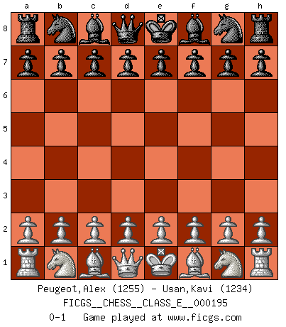 Last move : 0-1 2017 March 15 8:8:6 [Event "FICGS__CHESS__CLASS_E__000195"] [Site "FICGS"] [Date "2017.02.02"] [Round "1"] [White "Peugeot,Alex"] [Black "Usan,Kavi"] [Result "0-1"] [WhiteElo "1255"] [BlackElo "1234"] 0-1 This chess game has been lost on time (started : 2017.02.02 23:36:44) Player Black won this chess game. Follow this game move after move (download)Pawns: they are the soul of this game, they alone form the attack and defense. (Philidor) Stil? Ich habe keinen Stil! (Anatoly Karpov) En la vida, como en el Ajedrez, los Peones propios obstruyen nuestro camino. La gran fortuna de un hombre, su comodidad, placer, hijos, libros, que deberían ayudarle a ganar, con mucha frecuencia lo ponen en Jaque Mate. (Charles Buxton) La tactique est l'élément le plus important du milieu de jeu. (Siegbert Tarrasch) The best weapon against an enemy is another enemy. (Friedrich Nietzsche)
