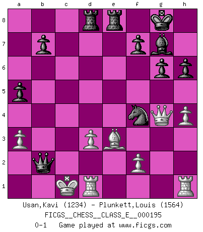 Last move : 0-1 2017 March 22 21:2:22 [Event "FICGS__CHESS__CLASS_E__000195"] [Site "FICGS"] [Date "2017.02.02"] [Round "1"] [White "Usan,Kavi"] [Black "Plunkett,Louis"] [Result "0-1"] [WhiteElo "1234"] [BlackElo "1564"] 1.d4 d5 2.Nc3 g6 3.Nf3 Bg7 4.e3 Bg4 5.h3 Bf5 6.g4 Bc8 7.Bg2 c6 8.Bd2 Nd7 9.e4 dxe4 10.Nxe4 Ngf6 11.Qe2 Nxe4 12.Qxe4 Nf6 13.Qd3 O-O 14.Ng5 Qc7 15.h4 Bxg4 16.Bf3 Bh5 17.O-O-O Rad8 18.Bc3 h6 19.Bxh5 Nxh5 20.Nh3 e5 21.Kb1 exd4 22.Bb4 c5 23.Bd2 c4 24.Qf3 Qb6 25.b3 a5 26.Nf4 Nf6 27.Qe2 d3 28.cxd3 cxb3 29.a3 Rfe8 30.Be3 Qd6 31.Kb2 Nd5 32.Kxb3 Nxf4 33.Qg4 Qd5+ 34.Kc2 Qa2+ 35.Kc1 Qb2+ 0-1 Queen's pawn : Chigorin variation Kingside Castling by player Black (move 13) Queenside Castling by player White (move 17) Player Black won this chess game. Follow this game move after move (download)First-class players lose to second class players because second-class players sometimes play a first-class game. (Tarrasch) Ich bewundere Kasparows phantasievolle Angriffssiege aus den Achtzigern und Neunzigern, aber wenn man sie mit dem Computer überprüft, nimmt der Computer in jeder zweiten Partie die Opfer an, verteidigt sich und gewinnt. (Vladimir Kramnik) Bobby Fischer es el mas grande genio de Ajedrez de todos los tiempos. (Alexander Kotov) C'est la seule position que je connaisse où les deux camps sont mals. Propos prêtés à V. Anand. CHESS, n. f. [echecs, Fr.] A nice and abstruse game, in which two sets of puppets are moved in opposition to each other. (Dr Samuel Johnson, A Dictionary Of The English Language, 1755)
