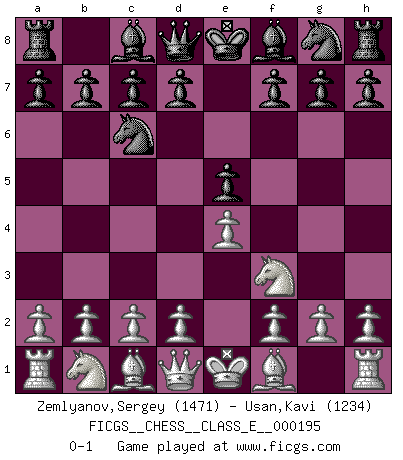 Last move : 0-1 2017 March 16 8:8:57 [Event "FICGS__CHESS__CLASS_E__000195"] [Site "FICGS"] [Date "2017.02.02"] [Round "1"] [White "Zemlyanov,Sergey"] [Black "Usan,Kavi"] [Result "0-1"] [WhiteElo "1471"] [BlackElo "1234"] 1.e4 e5 2.Nf3 Nc6 0-1 This chess game has been lost on time (started : 2017.02.02 23:36:44) King's pawn game Player Black won this chess game. Follow this game move after move (download)Chess, like love, like music, has the power to make people happy. (Siegbert Tarrasch) Man braucht nicht immer den besten Zug zu spielen: Ein Zug muß aktiv, unternehmungslustig, korrekt und schön sein. (David Bronstein) El Ajedrez lo es todo: arte, ciencia y deporte. (Anatoly Karpov) J'ai toujours senti une vague pitié pour l'homme qui ne connaît rien aux échecs, tout comme j'en aurais pour un homme ignorant de l'amour. Les Echecs, comme la musique ou comme l'amour, ont le pouvoir de rendre heureux. (Siegbert Tarrasch) Life is painting a picture, not doing a sum. (Oliver Wendell Holmes, Jr.)
