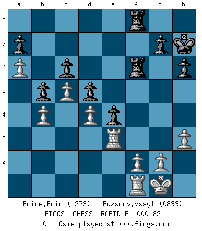 Last move : 1-0 2017 April 27 19:17:28 [Event "FICGS__CHESS__RAPID_E__000182"] [Site "FICGS"] [Date "2017.02.02"] [Round "1"] [White "Price,Eric"] [Black "Puzanov,Vasyl"] [Result "1-0"] [WhiteElo "1273"] [BlackElo "0899"] 1.e4 e5 2.Nf3 f5 3.Nxe5 Qf6 4.d4 d6 5.Nc4 fxe4 6.Nc3 Bf5 7.Nd5 Qd8 8.Bg5 Be7 9.Bxe7 Nxe7 10.Nce3 O-O 11.Bc4 Kh8 12.Be2 Nxd5 13.Nxd5 Nd7 14.c4 c6 15.Ne3 Qf6 16.O-O Rad8 17.b4 h6 18.h3 Bg6 19.a4 Qf7 20.a5 Nf6 21.a6 b6 22.Qa4 Rc8 23.Qa2 d5 24.c5 b5 25.Qd2 Nh7 26.Ng4 Nf6 27.Ne5 Qe8 28.Qd1 Bh7 29.Ra3 Nd7 30.Bh5 Qe7 31.Ng4 Nf6 32.Ne5 Nd7 33.Nxd7 Qxd7 34.Rg3 Rf6 35.Bg4 Bf5 36.Bxf5 Qxf5 37.Qg4 Qxg4 38.Rxg4 Rcf8 39.Rg3 Kh7 40.Re3 1-0 Latvian counter-gambit Kingside Castling by player Black (move 10) Kingside Castling by player White (move 16) Player White won this chess game. Follow this game move after move (download)No Chess Grandmaster is normal; they only differ in the extent of their madness. (Viktor Korchnoi) Ein Gewinn durch eine ungenaue Kombination, sei sie auch noch so vorzeigbar, erfüllt mich mit Schaudern. (Wilhelm Steinitz) Solo los afeminados hacen el Enroque. (Rob Sillars) La vérité est comme le meilleur coup aux échecs : elle existe, mais il faut la chercher. (Arturo Perez-Reverte) Strategy without tactics is the slowest route to victory. Tactics without strategy is the noise before defeat. (Sun Tzu)