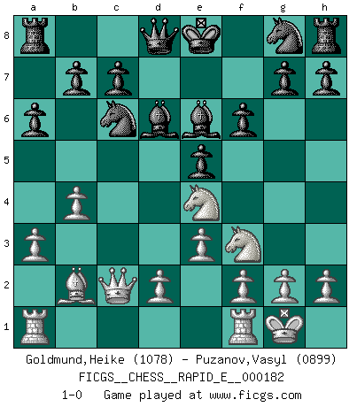 Last move : 1-0 2017 March 25 0:11:10 [Event "FICGS__CHESS__RAPID_E__000182"] [Site "FICGS"] [Date "2017.02.02"] [Round "1"] [White "Goldmund,Heike"] [Black "Puzanov,Vasyl"] [Result "1-0"] [WhiteElo "1078"] [BlackElo "0899"] 1.b4 e5 2.Bb2 f6 3.a3 a6 4.c4 d5 5.e3 Be6 6.Nf3 dxc4 7.Bxc4 Bxc4 8.Qc2 Be6 9.O-O Nc6 10.Nc3 Bd6 11.Ne4 1-0 Polish (Sokolsky) opening Kingside Castling by player White (move 9) Player White won this chess game. Follow this game move after move (download)If I win a tournament, I win it by myself. I do the playing. Nobody helps me. (Bobby Fischer) Es hat in meinem Leben Zeiten gegeben, da ich sehr nahe daran war zu glauben, daß ich auch nicht eine einzige Schachpartie verlieren könnte. (José Raúl Capablanca) Existen dos clases de sacrificios: los correctos y los míos. (Mikhail Tal) Le joueur d'Echecs qui veut atteindre le top est obligé de développer son propre credo créatif. Alexeï Stepanovicth Souétine. Il est facile d'écrire des livres ! Ce qui est difficile, c'est de jouer ! (Alexeï Stepanovicth Souétine) I fear not the man who has practiced 10,000 kicks once, but I fear the man who has practiced one kick 10,000 times. (Bruce Lee)