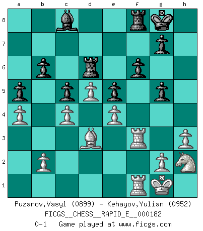 Last move : 0-1 2017 June 16 9:10:39 [Event "FICGS__CHESS__RAPID_E__000182"] [Site "FICGS"] [Date "2017.02.02"] [Round "1"] [White "Puzanov,Vasyl"] [Black "Kehayov,Yulian"] [Result "0-1"] [WhiteElo "0899"] [BlackElo "0952"] 1.e4 e5 2.f4 exf4 3.Nf3 d6 4.d4 h6 5.Bxf4 Nf6 6.Bd3 Be7 7.O-O O-O 8.Nbd2 b6 9.c3 c5 10.d5 Nbd7 11.c4 Nh5 12.Be3 Ne5 13.Nxe5 dxe5 14.Qxh5 Bg5 15.Bxg5 Qxg5 16.Qxg5 hxg5 17.Nf3 f6 18.h3 Bb7 19.Nh2 a5 20.a4 Rad8 21.Rf3 Rd6 22.Raf1 Bc8 0-1 This chess game has been lost on time (started : 2017.02.02 23:37:18) KGA : Fischer defense Kingside Castling by player White (move 7) Kingside Castling by player Black (move 7) Player Black won this chess game. Follow this game move after move (download)I give 98 percent of my mental energy to Chess. Others give only 2 percent. (Bobby Fischer) Dein Körper muss in Topform sein. Dein Schach verfällt, wenn dein Körper verfällt. Der Körper kann nicht vom Geist getrennt werden. (Robert James Fischer) La partida mas dura de ganar es una partida ganada. (Emanuel Lasker) Plusieurs personnes se sont demandées comment Tal faisait pour gagner... En fait, c'est très simple ! Il met ses pièces au centre de l'échiquier et les sacrifie quelque part ! (David Bronstein) All politicians must be presumed guilty until they are proven innocent. (Dinesh De Silva)