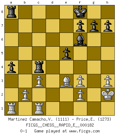 Last move : 0-1 2017 April 8 23:4:4 [Event "FICGS__CHESS__RAPID_E__000182"] [Site "FICGS"] [Date "2017.02.02"] [Round "1"] [White "Martinez Camacho,Victor Hugo"] [Black "Price,Eric"] [Result "0-1"] [WhiteElo "1111"] [BlackElo "1273"] 1.e4 e5 2.Nf3 Nc6 3.Bb5 a6 4.Ba4 Nf6 5.d3 b5 6.Bb3 d6 7.h3 Na5 8.Ng5 Nxb3 9.axb3 Be7 10.O-O O-O 11.Be3 d5 12.exd5 Qxd5 13.Nc3 Qc6 14.Qf3 Bb7 15.Qxc6 Bxc6 16.Nf3 Bxf3 17.gxf3 c5 18.Ne4 Rfc8 19.Kh2 c4 20.bxc4 bxc4 21.Rg1 Kf8 22.Nxf6 Bxf6 23.dxc4 Rxc4 24.c3 a5 25.Rgc1 a4 0-1 This chess game has been lost on time (started : 2017.02.02 23:37:18) Ruy Lopez : Anderssen variation Kingside Castling by player White (move 10) Kingside Castling by player Black (move 10) Player Black won this chess game. Follow this game move after move (download)All that matters on the Chessboard is good moves. (Bobby Fischer) Ich tröste mich mit dem Vergnügen, daß Schachfans, Zuschauer und Leser glücklich sind, wenn ein Großmeister etwas riskiert, statt nur Klötzchen zu schieben. (Mikhail Nekhemyevich Tal) Las Aperturas te enseñan aperturas. ¡Los Finales te enseñan Ajedrez!. (Stephan Gerzadowicz) Le plus grand jeu de l'esprit jamais inventé, plus vous l'apprenez, plus vous y prenez du plaisir. (Garry Kasparov) The greatest con, that he ever pulled... was making you believe... that he is you. (Revolver, movie)