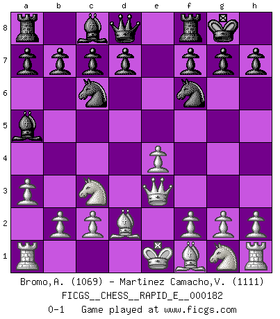 Last move : 0-1 2017 March 23 8:47:2 [Event "FICGS__CHESS__RAPID_E__000182"] [Site "FICGS"] [Date "2017.02.02"] [Round "1"] [White "Bromo,Alexis"] [Black "Martinez Camacho,Victor Hugo"] [Result "0-1"] [WhiteElo "1069"] [BlackElo "1111"] 1.e4 e5 2.d4 exd4 3.Qxd4 Nc6 4.Qe3 Nf6 5.Nc3 Bb4 6.a3 Ba5 7.Bd2 O-O 0-1 This chess game has been lost on time (started : 2017.02.02 23:37:18) Centre game : Berger variation Kingside Castling by player Black (move 7) Player Black won this chess game. Follow this game move after move (download)My style is somewhere between that of Tal and Petrosian. (Reshevsky) Die Partien sind immer verschieden, die Interviews immer die gleichen. (Garry Kasparov) Solo el jugador con la iniciativa tiene el derecho a atacar. (Wilhelm Steinitz) Mon pion favori sur ma case favorite ! Bronstein en parlant d'un coup de pion en h5 quand il avait les Noirs. I'm extremely disappointed. I send you out for exciting, new designer drugs, you come back with tomato sauce. (Gregory House, House M.D.)