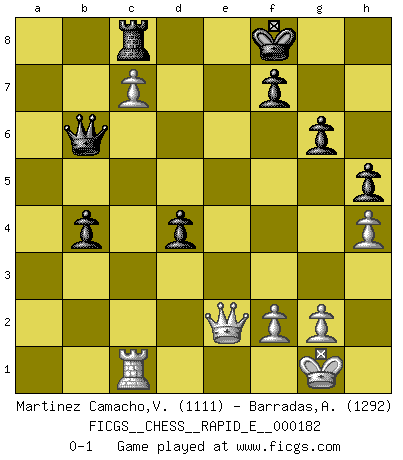 Last move : 0-1 2017 April 28 13:21:15 [Event "FICGS__CHESS__RAPID_E__000182"] [Site "FICGS"] [Date "2017.02.02"] [Round "1"] [White "Martinez Camacho,Victor Hugo"] [Black "Barradas,Anderson"] [Result "0-1"] [WhiteElo "1111"] [BlackElo "1292"] 1.e4 e5 2.Nf3 Nc6 3.Bb5 a6 4.Ba4 b5 5.Bb3 Nf6 6.d3 Bc5 7.Ng5 O-O 8.O-O d5 9.exd5 Nd4 10.Nc3 Bb7 11.Re1 Re8 12.Be3 Nxb3 13.axb3 Bd4 14.Bxd4 exd4 15.Rxe8+ Nxe8 16.Qf3 Qxg5 17.Ne4 Qg6 18.Nc5 Nd6 19.c4 c6 20.Nxb7 Nxb7 21.dxc6 Nc5 22.b4 Nxd3 23.cxb5 Nxb2 24.c7 Rc8 25.b6 Qxb6 26.Rc1 g6 27.Qb3 a5 28.Qxb2 axb4 29.h4 h5 30.Qe2 Kf8 0-1 This chess game has been lost on time (started : 2017.02.02 23:37:18) Ruy Lopez : Caro variation Kingside Castling by player Black (move 7) Kingside Castling by player White (move 8) Player Black won this chess game. Follow this game move after move (download)The beauty of a move lies not in its' appearance but in the thought behind it. (Siegbert Tarrasch) Um dein Spiel zu verbessern musst du zuallererst das Endspiel studieren, denn diese kann unabhängig studiert werden. Die Eröffnung und das Mittelspiel müssen immer in Bezug gesetzt werden zum Endspiel. (José Raúl Capablanca) El Ajedrez es imaginación. (David Bronstein) Le profane ne songe pas à la somme de jouissance dont il se prive, qui méconnaît ce jeu aux ressources aussi variées que passionnantes. (Jean-Marie Jeanton-Lamarche) A bird doesn't sing because it has an answer, it sings because it has a song. (Maya Angelou)