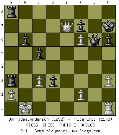 Last move : 0-1 2017 February 5 22:30:5 [Event "FICGS__CHESS__RAPID_E__000182"] [Site "FICGS"] [Date "2017.02.02"] [Round "1"] [White "Barradas,Anderson"] [Black "Price,Eric"] [Result "0-1"] [WhiteElo "1292"] [BlackElo "1273"] 1.e4 e5 2.Nf3 Nc6 3.d4 exd4 4.Nxd4 Bc5 5.c3 Qf6 6.Be3 Nge7 7.b4 Bb6 8.Na3 O-O 9.Nc4 d5 10.Nxb6 axb6 11.b5 Ne5 12.Be2 dxe4 13.Qd2 h6 14.h3 c5 15.bxc6 bxc6 16.g4 Qh4 17.O-O-O Ba6 18.Nf5 Nxf5 19.gxf5 Bxe2 20.Qxe2 Nd3+ 21.Kb1 Ra3 22.Bd4 c5 23.Bxg7 Kxg7 24.Rxd3 exd3 25.Qe5+ Kh7 26.f6 Qg5 27.Qe7 Qg8 28.Qe4+ Qg6 29.Qe7 Rfa8 0-1 Scotch game Kingside Castling by player Black (move 8) Queenside Castling by player White (move 17) Player Black won this chess game. Follow this game move after move (download)When I have White, I win because I am white; When I have Black, I win because I am Bogolyubov. (Bogolyubov) Nur ein wirklich starker Spieler weiß wie schwach er spielt. (Savielly Grigorievitsch Tartakower) El jugador táctico sabe que hacer cuando hay algo que hacer; mientras que el estratega sabe que hacer cuando no hay nada que hacer. (Gerald Abrahams) Vouloir jouer aux échecs contre soi-même est aussi paradoxal que vouloir marcher sur son ombre. (Stefan Zweig) Begin at the beginning and go on till you come to the end; then stop. (Lewis Carrol, Alice in Wonderland)