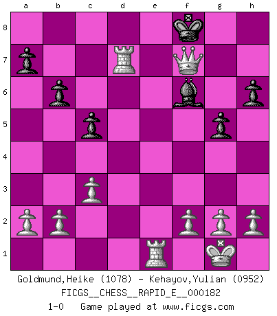 Last move : 1-0 2017 May 11 12:19:24 [Event "FICGS__CHESS__RAPID_E__000182"] [Site "FICGS"] [Date "2017.02.02"] [Round "1"] [White "Goldmund,Heike"] [Black "Kehayov,Yulian"] [Result "1-0"] [WhiteElo "1078"] [BlackElo "0952"] 1.e4 e5 2.Nf3 Nf6 3.d4 exd4 4.Qxd4 c5 5.Qa4 Be7 6.Bc4 h6 7.c3 O-O 8.O-O d6 9.Qc2 Re8 10.Bf4 Bd7 11.e5 dxe5 12.Nxe5 Nc6 13.Bxf7+ Kh8 14.Bxe8 Bxe8 15.Na3 Nxe5 16.Bxe5 Ng4 17.Bg3 Bf6 18.Rad1 Qc7 19.Bxc7 Rc8 20.Bd6 b6 21.Nc4 Bf7 22.Qe4 Bxc4 23.Qxc4 Rd8 24.Qxg4 Rxd6 25.Rxd6 Kg8 26.Qf5 Kf7 27.Rd7+ Ke8 28.Re1+ Kf8 29.Qe6 g5 30.Qf7+ 1-0 Petrov : Modern (Steinitz) attack Kingside Castling by player Black (move 7) Kingside Castling by player White (move 8) Player White won this chess game. Follow this game move after move (download)In Chess, just as in life, today's bliss may be tomorrow's poison. (Assaic) Wenn du gegen Bobby spielst, ist es keine Frage von gewinnen oder verlieren. Es ist eine Frage des Überlebens. (Boris Vassilievich Spassky) Los libros de Ajedrez deben de usarse igual como usamos los anteojos: para mejorar la vista, aunque algunos jugadores los quieren usar como si ellos les otorgaran la vision. (José Raúl Capablanca) Votre prénom est 'Tactique', votre deuxième prénom est 'Tactique' et votre nom est 'Tactique'. (Ken Smith) The Internet is so big, so powerful and pointless that for some people it is a complete substitute for life. (Andrew Brown)