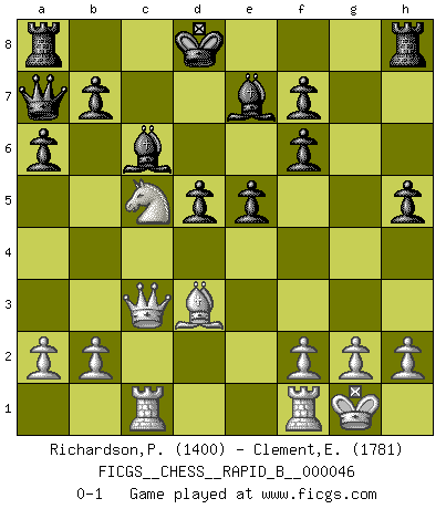 Last move : 0-1 2007 April 18 22:39:12 [Event "FICGS__CHESS__RAPID_B__000046"] [Site "FICGS"] [Date "2007.04.03"] [Round "1"] [White "Richardson,Patrick"] [Black "Clement,Etienne"] [Result "0-1"] [WhiteElo "1400"] [BlackElo "1781"] 1.e4 c5 2.Nf3 Nc6 3.d4 cxd4 4.Bc4 Nf6 5.e5 Nxe5 6.Nxe5 Qa5+ 7.c3 Qxe5+ 8.Be2 dxc3 9.Nxc3 e6 10.Be3 d5 11.Bd4 Qb8 12.Bxf6 gxf6 13.Bb5+ Kd8 14.O-O a6 15.Qd4 Be7 16.Bd3 Bd7 17.Rac1 h5 18.Na4 Bc6 19.Nc5 e5 20.Qc3 Qa7 0-1 Sicilian defense Kingside Castling by player White (move 14) Player Black won this chess game. Follow this game move after move (download)All that matters on the Chessboard is good moves. (Bobby Fischer) Später, ... hatte ich zunehmend Erfolg in entscheidenden Partien. Vielleicht weil ich eine einfache Wahrheit erkannte: nicht nur ich hatte Angst, auch mein Gegner. (Mikhail Nekhemyevich Tal) El Ajedrez se juega con la mente... ¡no con las manos!. (Renaud y Kahn) Des combinaisons [dans le jeu d'échecs] pareilles à des mélodies. Je crois entendre pour ainsi dire la musique des coups... (Vladimir Nabokov) A generalist learns less and less about more and more until he knows nothing about everything. (Author unknown)
