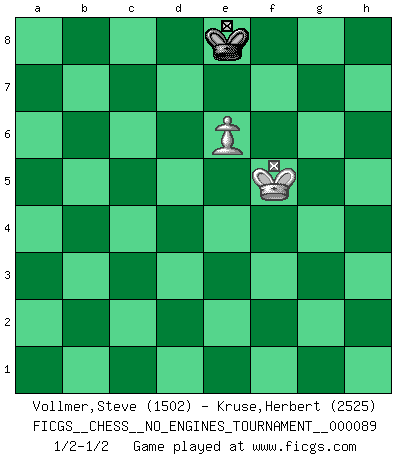 Last move : 1/2-1/2 2017 February 10 21:22:54 [Event "FICGS__CHESS__NO_ENGINES_TOURNAMENT__000089"] [Site "FICGS"] [Date "2017.02.04"] [Round "1"] [White "Vollmer,Steve"] [Black "Kruse,Herbert"] [Result "1/2-1/2"] [WhiteElo "1502"] [BlackElo "2525"] 1.d4 d5 2.c4 e5 3.dxe5 d4 4.Nf3 Nc6 5.g3 Nge7 6.Bg2 Ng6 7.O-O Be7 8.Nbd2 O-O 9.b3 Ncxe5 10.Nxe5 Nxe5 11.Bb2 c5 12.Nf3 Nxf3+ 13.Bxf3 Bf6 14.Qd3 Qb6 15.Rfe1 g6 16.Rad1 Bf5 17.Be4 Bxe4 18.Qxe4 Rfe8 19.Qg2 Re7 20.e3 dxe3 21.Bxf6 Qxf6 22.Rxe3 Rxe3 23.fxe3 Qe7 24.Qd2 Re8 25.Kf2 h5 26.h4 Qf6+ 27.Kg2 Qe5 28.Re1 Qe4+ 29.Kh2 b6 30.Qg2 Qd3 31.Qf3 Re7 32.Kg2 Kg7 33.e4 Qxf3+ 34.Kxf3 Rd7 35.a4 Kf6 36.Kf4 Rd4 37.Re3 Ke6 38.Rc3 Rd1 39.Rf3 f6 40.Re3 Rf1+ 41.Rf3 g5+ 42.Ke3 Re1+ 43.Kd3 Rh1 44.hxg5 fxg5 45.Rf5 g4 46.Ke3 Rh2 47.Rf2 Rh3 48.Kf4 h4 49.gxh4 Rxh4 50.Kg5 Rh3 51.Rb2 g3 52.Kf4 Rh2 53.Rb1 g2 54.Rg1 Rh3 55.Rxg2 Rxb3 56.a5 Rb4 57.Rg5 Rxc4 58.axb6 axb6 59.Rg6+ Ke7 60.Rxb6 Rc1 61.Ke5 Rh1 62.Rb7+ Kd8 63.Kd6 Rh6+ 64.Kxc5 Rg6 65.e5 Rh6 66.Kd5 Rg6 67.e6 Rg1 68.Rb4 Rd1+ 69.Rd4 Rxd4+ 70.Kxd4 Ke7 71.Kd5 Ke8 72.Kd6 Kd8 73.Ke5 Ke7 74.Kf5 Ke8 1/2-1/2 QGD : Albin counter-gambit, 5.g3 Kingside Castling by player White (move 7) Kingside Castling by player Black (move 8) 10 pieces endgame at move 55 : White KRPPP , Black KRPPP WHITE : King + 1 Rook 3 Pawns BLACK : King + 1 Rook 3 Pawns 9 pieces endgame at move 57 : White KRPP , Black KRPPP WHITE : King + 1 Rook 2 Pawns BLACK : King + 1 Rook 3 Pawns 8 pieces endgame at move 58 : White KRPP , Black KRPP WHITE : King + 1 Rook 2 Pawns BLACK : King + 1 Rook 2 Pawns 7 pieces endgame at move 58 : White KRP , Black KRPP WHITE : King + 1 Rook 1 Pawn BLACK : King + 1 Rook 2 Pawns 6 pieces endgame at move 60 : White KRP , Black KRP WHITE : King + 1 Rook 1 Pawn BLACK : King + 1 Rook 1 Pawn 5 pieces endgame at move 64 : White KRP , Black KR WHITE : King + 1 Rook 1 Pawn BLACK : King + 1 Rook 4 pieces endgame at move 69 : White KP , Black KR WHITE : King + 1 Pawn BLACK : King + 1 Rook 3 pieces endgame at move 70 : White KP , Black K WHITE : King + 1 Pawn BLACK : King + This chess game ended in a draw. Follow this game move after move (download)A bad day of Chess is better than any good day at work. (Anonymous) Wenn ein Kopf und ein Buch zusammenstoßen und es klingt hohl, ist es denn allemal im Buche? (Georg Christoph Lichtenberg) Los errores estan ahí, esperando a que se cometan. (Savielly Tartakower) Pour se monter efficace, un Cavalier a besoin d'avant-postes ! Les Cavaliers font les meilleurs bloqueurs de pions passés. I've lost money so fast in these clubs it's left me reeling. I've read every poker book ever written, but the only way to get better at the game is to go out and play with people who are really good. The problem is, you stand to lose a lot of money doing it. (Matt Damon)