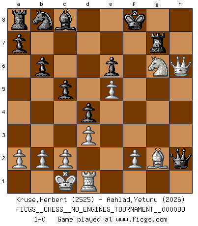 Last move : 1-0 2017 March 10 19:28:30 [Event "FICGS__CHESS__NO_ENGINES_TOURNAMENT__000089"] [Site "FICGS"] [Date "2017.02.04"] [Round "1"] [White "Kruse,Herbert"] [Black "Aahlad,Yeturu"] [Result "1-0"] [WhiteElo "2525"] [BlackElo "2026"] 1.e4 c5 2.g4 d5 3.Nc3 d4 4.Nd5 g5 5.d3 e6 6.Bxg5 f6 7.Nxf6+ Nxf6 8.e5 Qd5 9.Bxf6 Qxh1 10.Nf3 Rg8 11.g5 b6 12.Nh4 Kd7 13.Qh5 Be7 14.Bxe7 Kxe7 15.Qxh7+ Kf8 16.O-O-O Rxg5 17.Qh6+ Rg7 18.Bg2 Qxh2 19.Ng6+ 1-0 Sicilian defense Queenside Castling by player White (move 16) Player White won this chess game. Follow this game move after move (download)Nothing excites jaded Grandmasters more than a theoretical novelty. (Dominic Lawson) Wer wird heute Abend ihr Gegner sein? -- Heute Abend spiele ich gegen die schwarzen Steine. (Akiba Rubinstein) El Ajedrez es como la guerra en un tablero. (Bobby Fischer) La vie et les Echecs sont tous les deux une lutte constante. (Lasker) Are you threatening me, Master Jedi ? (Chancellor Palpatine in Star Wars ep.3)