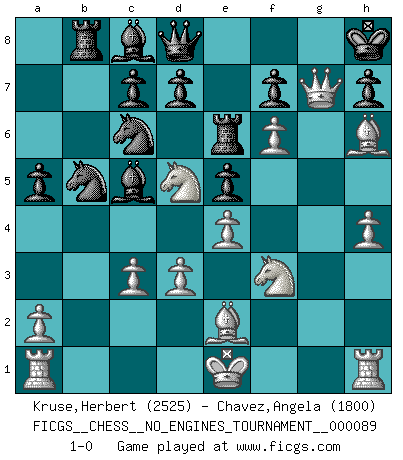 Last move : 1-0 2017 March 20 0:46:59 [Event "FICGS__CHESS__NO_ENGINES_TOURNAMENT__000089"] [Site "FICGS"] [Date "2017.02.04"] [Round "1"] [White "Kruse,Herbert"] [Black "Chavez,Angela"] [Result "1-0"] [WhiteElo "2525"] [BlackElo "1800"] 1.e4 e5 2.Be2 Nc6 3.f4 Nf6 4.Nc3 Bd6 5.f5 O-O 6.g4 b5 7.g5 Ne8 8.d3 Rb8 9.Nf3 b4 10.Nd5 Bc5 11.f6 Nd6 12.h4 a5 13.c3 bxc3 14.bxc3 gxf6 15.gxf6 Nb5 16.Bh6 Re8 17.Qd2 Re6 18.Qg5+ Kh8 19.Qg7+ 1-0 King's pawn game Kingside Castling by player Black (move 5) Player White won this chess game. Follow this game move after move (download)One doesn't have to play well, it's enough to play better than your opponent. (Siegbert Tarrasch) Nie in meinem Leben habe ich die französische Verteidigung gespielt, welche die Stumpfsinnigste von allen ist. (Wilhelm Steinitz) Evita las multitudes. Haz independientemente tu propio razonamiento. Trata de ser el jugador de Ajedrez, no la pieza de Ajedrez. (Ralph Charell) Ne tendez aucun piège pour le plaisir ! Ne jouez rien dans l'espoir que l'adversaire réagisse de façon stupide ! Prenez toujours pour acquis que l'adversaire va trouver le meilleur coup ! Ne jouez jamais de coup dans l'espoir que l'adversaire ne voie pas la menace ! Chacun de vos coups doit améliorer la position d'une façon ou d'une autre. Sometimes it pays to stay in bed in Monday, rather than spending the rest of the week debugging Monday's code. (Dan Salomon)
