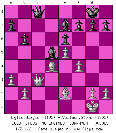 Last move : 1/2-1/2 2017 March 10 15:46:43 [Event "FICGS__CHESS__NO_ENGINES_TOURNAMENT__000089"] [Site "FICGS"] [Date "2017.02.04"] [Round "1"] [White "Niglio,Biagio"] [Black "Vollmer,Steve"] [Result "1/2-1/2"] [WhiteElo "1195"] [BlackElo "1502"] 1.e4 e6 2.d4 d5 3.Nc3 Nf6 4.e5 Nfd7 5.f4 c5 6.Nf3 Nc6 7.Be3 b6 8.Be2 Be7 9.O-O Bb7 10.Qd2 O-O 11.Nd1 cxd4 12.Nxd4 Nxd4 13.Bxd4 Qc7 14.Rc1 Nc5 15.Nf2 Rac8 16.c4 dxc4 17.Rxc4 Qb8 18.Rfc1 Ne4 19.Nxe4 Bxe4 20.Qe3 Bd5 21.Rxc8 Rxc8 22.a3 Qb7 23.Rxc8+ Qxc8 24.Qc3 1/2-1/2 French : Steinitz, Boleslavsky variation Kingside Castling by player White (move 9) Kingside Castling by player Black (move 10) This chess game ended in a draw. Follow this game move after move (download)Chess is a fighting game which is purely intellectual and includes chance. (Richard Reti) Wer sich die Fähigkeit anerziehen will im Schach selbstständig zu denken, der muß alles meiden, was leblos ist: ausgeklügelte Theorien, die sich auf sehr wenige Beispiele und eine Menge Hirngespinste stützen. (Emanuel Lasker) Por esta medida (el intervalo entre Fischer y sus contemporaneos), yo le considero el mas grande campeón mundial. (Garry Kasparov) La solitude du joueur d'Echecs à l'approche du mat est semblable à celle du condamné. (Francis Szpiner) Creativity is allowing yourself to make mistakes. Art is knowing which ones to keep. (Scott Adams)