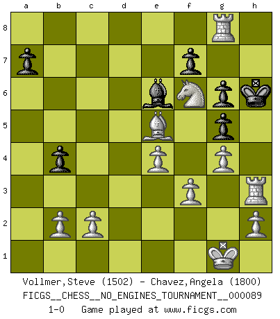 Last move : 1-0 2017 April 2 13:36:18 [Event "FICGS__CHESS__NO_ENGINES_TOURNAMENT__000089"] [Site "FICGS"] [Date "2017.02.04"] [Round "1"] [White "Vollmer,Steve"] [Black "Chavez,Angela"] [Result "1-0"] [WhiteElo "1502"] [BlackElo "1800"] 1.e4 e5 2.Nf3 Nf6 3.Nc3 Bd6 4.Bc4 O-O 5.O-O Nc6 6.d4 exd4 7.Nxd4 Be5 8.Nde2 d6 9.f3 b6 10.Be3 d5 11.Bxd5 b5 12.Bxc6 Rb8 13.Qxd8 Rxd8 14.Rad1 Rf8 15.Bf4 Rb6 16.Bd5 Nxd5 17.Nxd5 Rd6 18.Bxe5 Re6 19.Bxc7 Rg6 20.Ne7+ Kh8 21.Nxg6+ hxg6 22.Nf4 g5 23.Nh5 g6 24.Be5+ Kh7 25.Nf6+ Kh6 26.g4 b4 27.Rf2 Re8 28.Nxe8 Kh7 29.Rd8 Be6 30.Nf6+ Kg7 31.Rg8+ Kh6 32.Rg2 Bxa2 33.Rg3 Be6 34.Rh3+ 1-0 Petrov Three knights game Kingside Castling by player Black (move 4) Kingside Castling by player White (move 5) Player White won this chess game. Follow this game move after move (download)It is always better to sacrifice your opponent's men. (Savielly Tartakower) Ich war zu klein für die Schach-Schülermannschaft! (Woody Allen) Sin errores no puede haber brillantez. (Emanuel Lasker) Votre prénom est 'Tactique', votre deuxième prénom est 'Tactique' et votre nom est 'Tactique'. (Ken Smith) The Internet is the first thing that humanity has build that humanity doesn't understand, the largest experiment in anarchy that we have ever had. (Eric Schmidt)