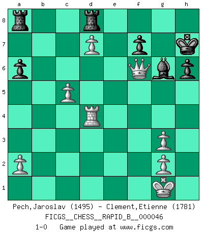 Last move : 1-0 2007 July 17 3:50:22 [Event "FICGS__CHESS__RAPID_B__000046"] [Site "FICGS"] [Date "2007.04.03"] [Round "1"] [White "Pech,Jaroslav"] [Black "Clement,Etienne"] [Result "1-0"] [WhiteElo "1495"] [BlackElo "1781"] 1.d4 Nf6 2.c4 e6 3.Nc3 Bb4 4.e3 O-O 5.Bd3 c5 6.Nf3 d5 7.O-O dxc4 8.Bxc4 cxd4 9.exd4 b6 10.Bg5 Bb7 11.Qe2 h6 12.Bh4 a6 13.Rad1 b5 14.Bb3 g5 15.Bg3 Re8 16.Ne5 Nc6 17.Nxc6 Bxc6 18.f4 g4 19.f5 exf5 20.Qd2 Bf8 21.Rxf5 Bd7 22.Rf4 Bg7 23.Bh4 Be6 24.d5 Bd7 25.Qf2 g3 26.hxg3 b4 27.Bxf6 Bxf6 28.Rxf6 bxc3 29.d6 Be6 30.Qd4 Qxf6 31.Qxf6 Bxb3 32.Rd4 Bc2 33.bxc3 Bg6 34.d7 Red8 35.c4 Kh7 36.c5 1-0 Nimzo-Indian : 4.e3 O-O, 5.Bd3 Kingside Castling by player Black (move 4) Kingside Castling by player White (move 7) Player White won this chess game. Follow this game move after move (download)The game of chess is the touchstone of the intellect. (Goethe) Ich verlor meine Bürgerrechte, mein Gehalt wurde mir nicht mehr bezahlt und ich wurde zensiert und durfte nicht mehr ins Ausland reisen. [nach dem Match Fischer-Taimanov 6:0] (Mark Taimanov) El Ajedrez es un juego terrible. Si no dominas el centro, tu oponente tiene una posición mas libre. Si tu tienes el centro, entonces realmente tienes algo de que preocuparte. (Siegbert Tarrasch) Je menace de comprendre la position. (Anonyme) Do you know these so called Volunteers don't even get paid! (Simpsons)