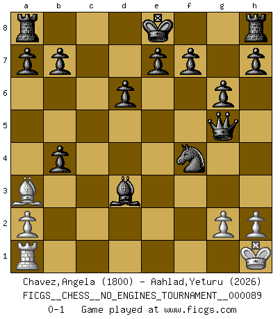 Last move : 0-1 2017 June 4 20:2:39 [Event "FICGS__CHESS__NO_ENGINES_TOURNAMENT__000089"] [Site "FICGS"] [Date "2017.02.04"] [Round "1"] [White "Chavez,Angela"] [Black "Aahlad,Yeturu"] [Result "0-1"] [WhiteElo "1800"] [BlackElo "2026"] 1.e4 c5 2.Nf3 Nc6 3.Bd3 g6 4.O-O Bg7 5.c4 d6 6.Nc3 Nf6 7.e5 Nxe5 8.b3 Nxd3 9.Qc2 Bf5 10.Ba3 Nxf2 11.d3 Nxd3 12.Ng5 Qa5 13.b4 cxb4 14.Nd5 Nxd5 15.Qxd3 Bxd3 16.Rfe1 Bxa1 17.Rxa1 Nf4 18.c5 Qxc5+ 19.Kh1 Qxg5 0-1 This chess game has been lost on time (started : 2017.02.04 16:14:57) Sicilian defense Kingside Castling by player White (move 4) Player Black won this chess game. Follow this game move after move (download)Chess makes man wiser and clear-sighted. (Vladimir Putin) Auf jeden Fall musst du zuerst Rechtsanwalt werden, damit du deine eigenen Interessen und die deiner Familie vertreten kannst. [Brief an seinen Sohn] (José Raúl Capablanca) Si no le temes a Spassky, entonces elimino el elemento del dinero. (Jim Slater) Karpov est une pièce de musée. (Garry Kasparov) Luck is what you have left over after you give 100 percent. (Langston Coleman)