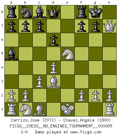 Last move : 1-0 2017 February 27 19:15:19 [Event "FICGS__CHESS__NO_ENGINES_TOURNAMENT__000089"] [Site "FICGS"] [Date "2017.02.04"] [Round "1"] [White "Carrizo,Jose"] [Black "Chavez,Angela"] [Result "1-0"] [WhiteElo "2071"] [BlackElo "1800"] 1.e4 e5 2.Nf3 Nf6 3.Nxe5 Nxe4 4.Qe2 Bc5 5.Qxe4 O-O 6.d4 Bb4+ 7.c3 Ba5 8.Bd3 d6 9.Qxh7+ 1-0 Petrov : Damiano variation Kingside Castling by player Black (move 5) Player White won this chess game. Follow this game move after move (download)Fischer sacrificed virtually everything most of us weakies (to use his term) value, respect, and cherish, for the sake of an artful, often beautiful board game, for the ambivalent privilege of being its greatest master. (Paul Kollar) Es ist im Leben wie im Schachspiel. Wir entwerfen einen Plan, dieser bleibt jedoch bedingt durch das, was im Schachspiel dem Gegner, im Leben dem Schicksal zu tun belieben wird. (Arthur Schopenhauer) Tu sabes, camarada Pachman, no disfruto el ser un Ministro, preferería jugar al Ajedrez como tu. (Che Guevara) Le jeu d'échecs fait naître et fortifie en nous plusieurs qualités précieuses dans le cours de l'existence, telles que la prévoyance, la circonspection, la prudence, et la persévérance. (Benjamin Franklin - 1783, la morale des échecs) Faith : not wanting to know what is true. (Friedrich Nietzsche)