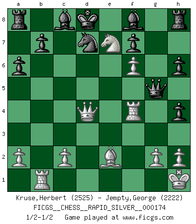 Last move : 1/2-1/2 2017 February 15 12:1:40 [Event "FICGS__CHESS__RAPID_SILVER__000174"] [Site "FICGS"] [Date "2017.02.05"] [Round "1"] [White "Kruse,Herbert"] [Black "Jempty,George"] [Result "1/2-1/2"] [WhiteElo "2525"] [BlackElo "2222"] 1.Nf3 c5 2.e4 d6 3.d4 cxd4 4.Nxd4 Nf6 5.Nc3 a6 6.Bg5 e6 7.f4 Qb6 8.Qd2 Qxb2 9.Rb1 Qa3 10.e5 h6 11.Bh4 dxe5 12.fxe5 g5 13.exf6 gxh4 14.Be2 Qa5 15.O-O Nd7 16.Kh1 Qg5 17.Rf4 e5 18.Nd5 exd4 19.Qxd4 Kd8 20.Ne7 1/2-1/2 Reti Opening Kingside Castling by player White (move 15) This chess game ended in a draw. Follow this game move after move (download)Pawns are born free, yet they are everywhere in chains. (Rick Kennedy) Obwohl ich vom Stil her kaum zu den Priestern der Schachkunst gezählt werde, halte ich Schach doch für eine Kunst. (Tigran Petrosjan) Un buen jugador siempre tiene buena suerte. (José Raúl Capablanca) L'action d'une oeuvre littéraire se déroule sur un champ de bataille. Les masques et les types du drame moderne correspondent aux pièces du jeu d'échecs. L'intrigue correspond aux coups et aux gambits, c'est à dire aux techniques du jeu telles qu'utilisées et interprétées par les joueurs. Les tactiques et les péripéties [mouvements] correspondent aux coups exécutés par l'adversaire. (Viktor Shklovsky) When it is a question of money, everybody is of the same religion. (Voltaire)