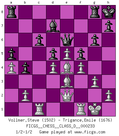 Last move : 1/2-1/2 2017 March 2 17:4:22 [Event "FICGS__CHESS__CLASS_D__000233"] [Site "FICGS"] [Date "2017.02.05"] [Round "1"] [White "Vollmer,Steve"] [Black "Trigance,Emile"] [Result "1/2-1/2"] [WhiteElo "1502"] [BlackElo "1676"] 1.e4 e5 2.Nf3 Nc6 3.Bb5 a6 4.Ba4 Nf6 5.O-O Nxe4 6.d4 b5 7.Bb3 d5 8.dxe5 Be6 9.c3 Bc5 10.Nbd2 O-O 11.Bc2 f5 12.a4 b4 13.Nb3 Bb6 14.Nbd4 Nxd4 15.Nxd4 Bxd4 16.cxd4 a5 17.f4 Qe7 18.Be3 g6 19.Bb3 c6 20.Qe2 Kh8 21.Rac1 Bd7 22.g3 Rg8 23.Bc2 Qe6 24.Bxe4 1/2-1/2 Ruy Lopez : Open, 7.Bb3 Kingside Castling by player White (move 5) Kingside Castling by player Black (move 10) This chess game ended in a draw. Follow this game move after move (download)You know, comrade Pachman, I don't enjoy being a Minister, I would rather play Chess like you. (Che Guevara) Schach ist ein Teil der Kultur, und wenn es mit der Kultur abwärts geht, geht es auch mit dem Schach abwärts. (Mikhail Moiseyevich Botvinik) El Ajedrez moderno está demasiado preocupado con cosas como la estructura de Peones. Olvidenlo, el Jaque Mate termina la partida. (Nigel Short) Que feriez-vous si vous étiez en train de jouer aux échecs et que la fin du monde arrive ? Je continuerais à jouer. (Saint Borromée) A good teacher is like a candle - it consumes itself to light the way for others. (Author unknown)