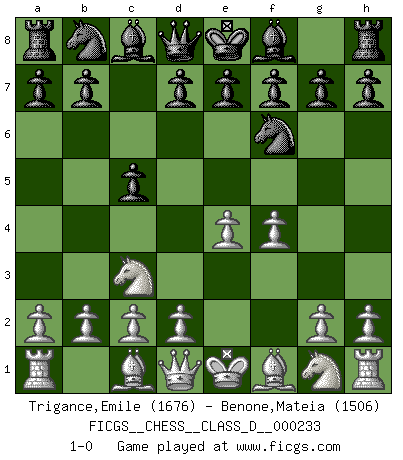 Last move : 1-0 2017 April 4 10:30:50 [Event "FICGS__CHESS__CLASS_D__000233"] [Site "FICGS"] [Date "2017.02.05"] [Round "1"] [White "Trigance,Emile"] [Black "Benone,Mateia"] [Result "1-0"] [WhiteElo "1676"] [BlackElo "1506"] 1.e4 c5 2.f4 Nf6 3.Nc3 1-0 This chess game has been lost on time (started : 2017.02.05 22:45:0) Sicilian : Grand Prix attack Player White won this chess game. Follow this game move after move (download)Chess is like war on a board. (Bobby Fischer) Spielt Blackmar-Diemer-Gambit, und das Matt kommt von selbst! (Emil Joseph Diemer) El Ajedrez es un juego terrible. Si no dominas el centro, tu oponente tiene una posición mas libre. Si tu tienes el centro, entonces realmente tienes algo de que preocuparte. (Siegbert Tarrasch) Il n'y a pas eu de défaite parce que je ne crois pas que cet ordinateur ait jamais existé. IBM a triché en refusant d'imprimer les modes de recherche de la machine. C'est évident, pendant le match, des coups décisifs ont été joués par des êtres humains. Aujourd'hui, les meilleurs spécialistes en informatique ne peuvent toujours pas expliquer comment Deep-Blue a pu jouer contre la logique des ordinateurs. IBM a gagné une guerre de communication, mais ils sont incapables de prouver que l'ordinateur a gagné tout seul. (Garry Kasparov) Horse racing is animated roulette. (Roger Kahn)